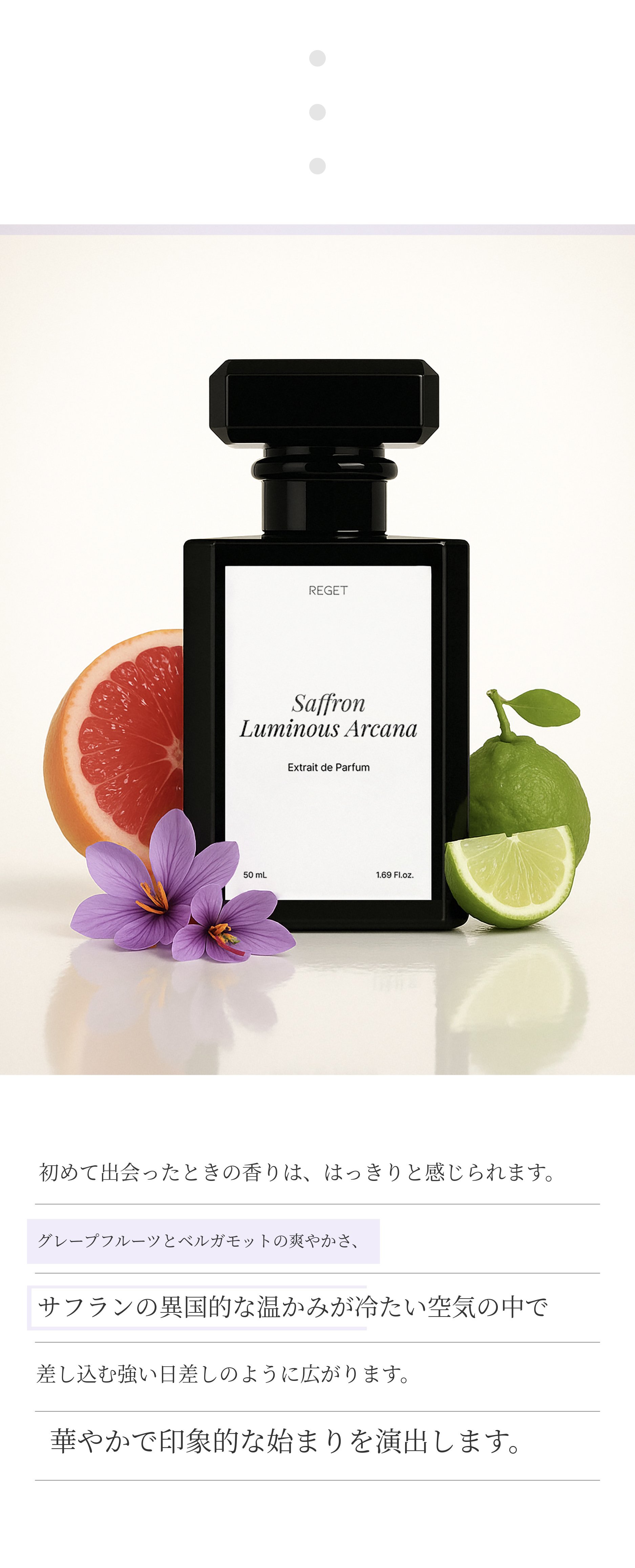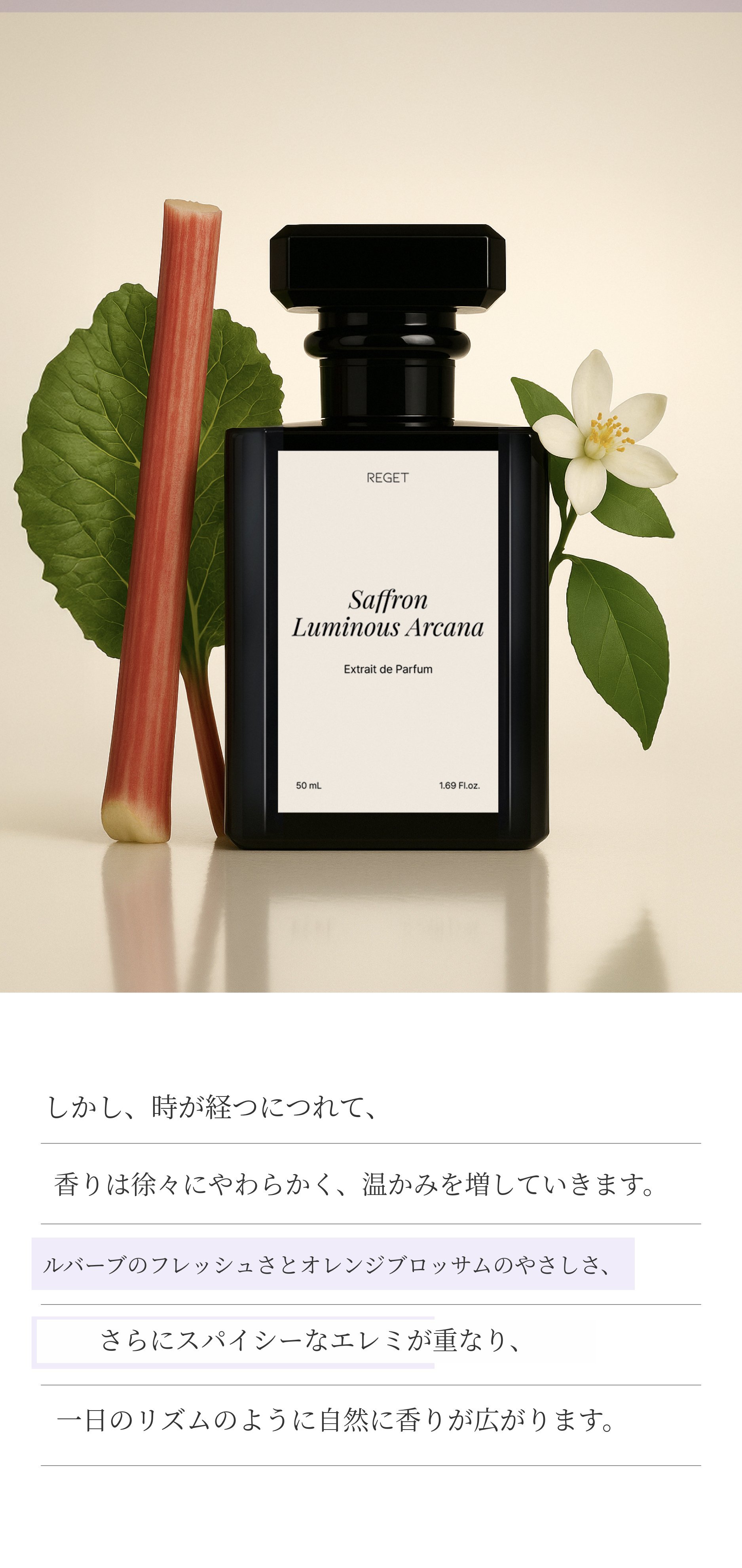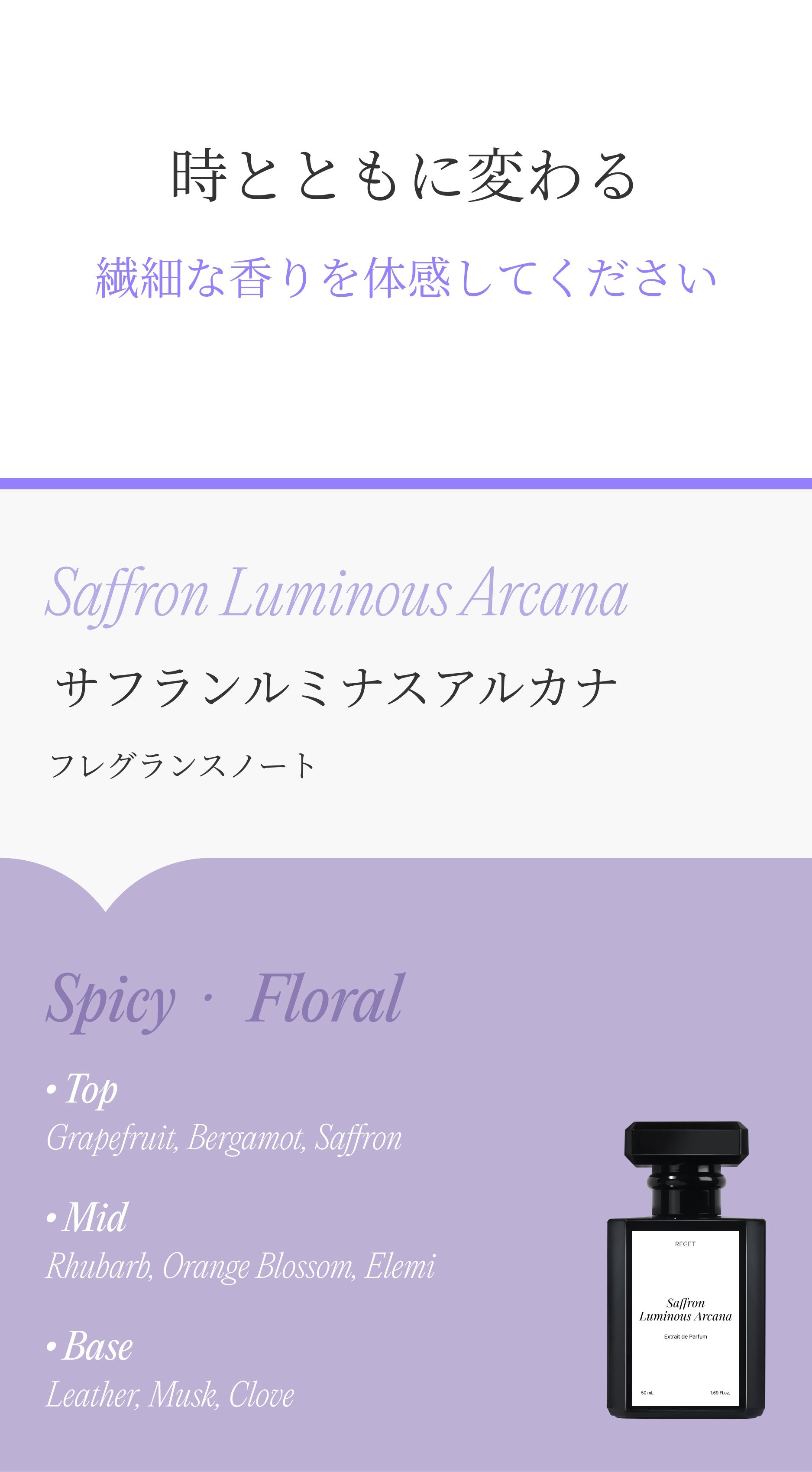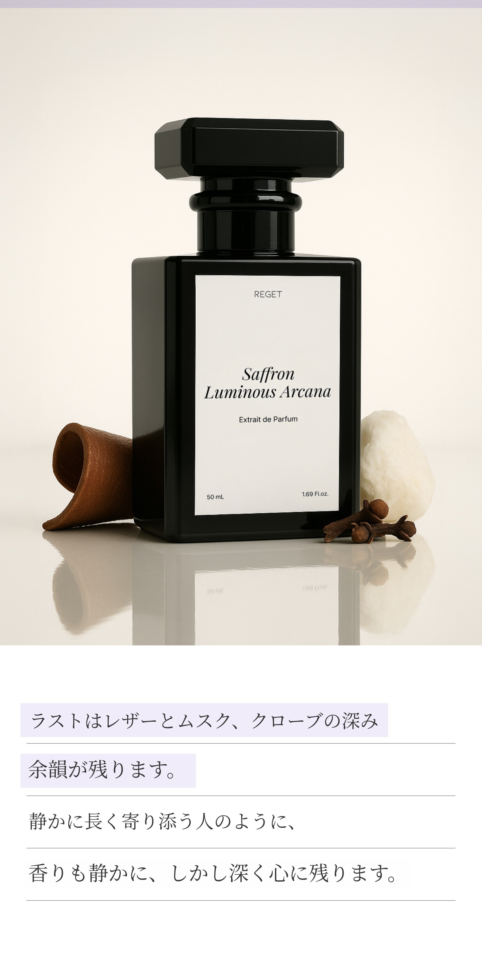 華やかではないが長く残る香り。サフラン ルミナス アルカナは、静かな歓喜のようにあなたのそばに染み渡ります。