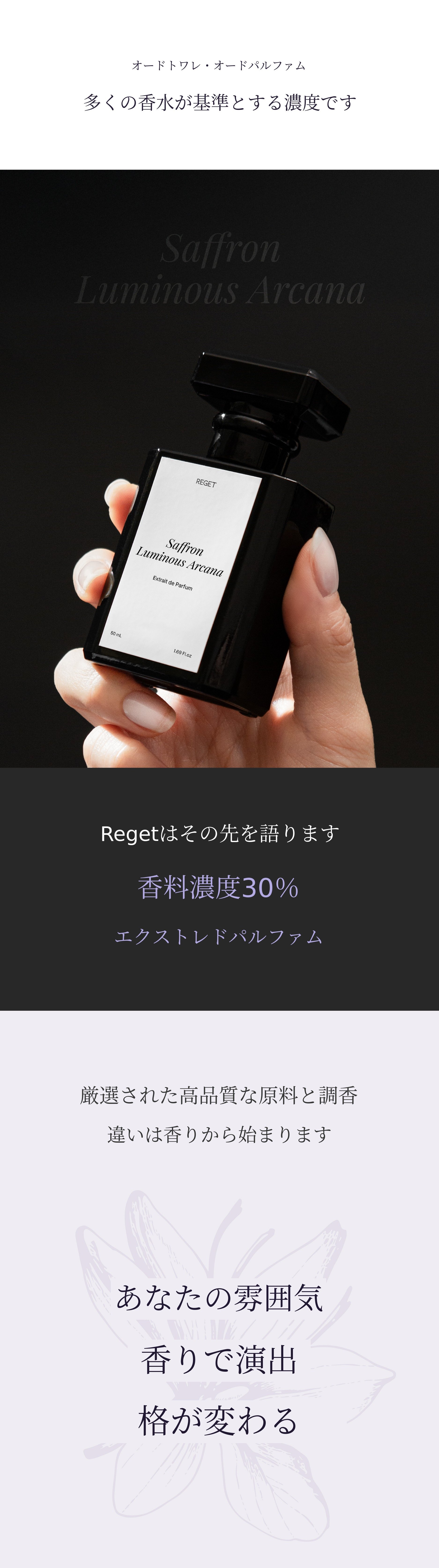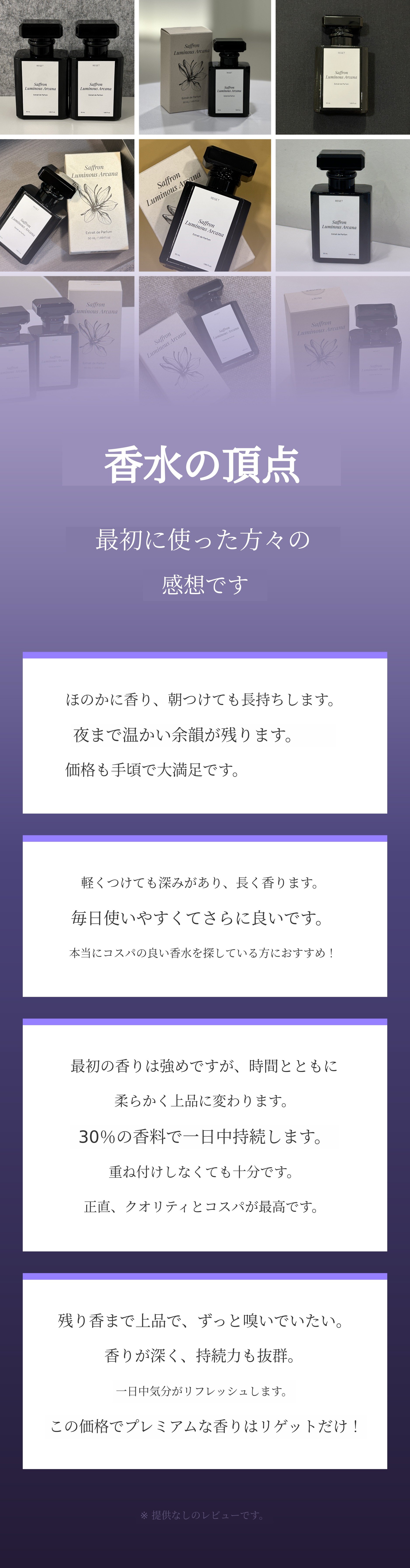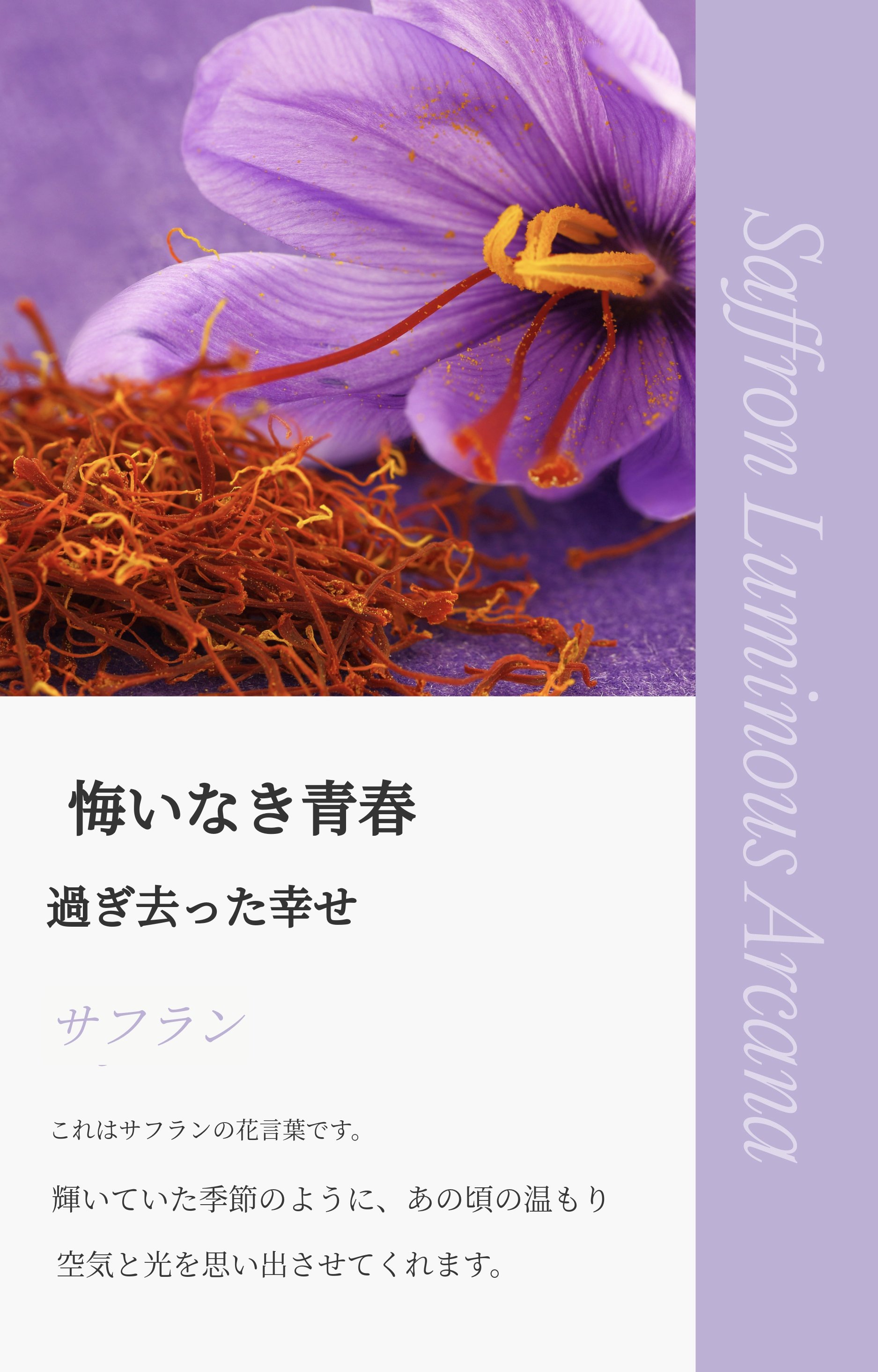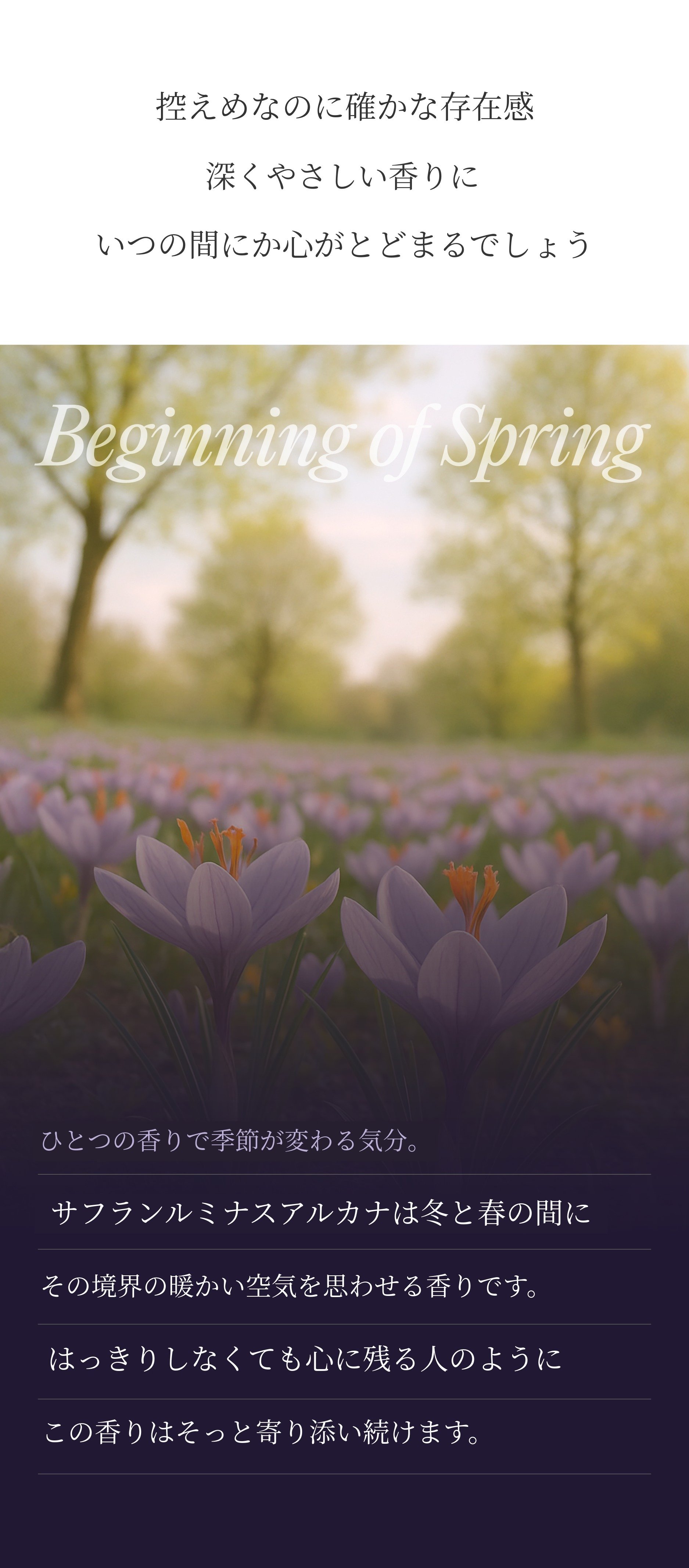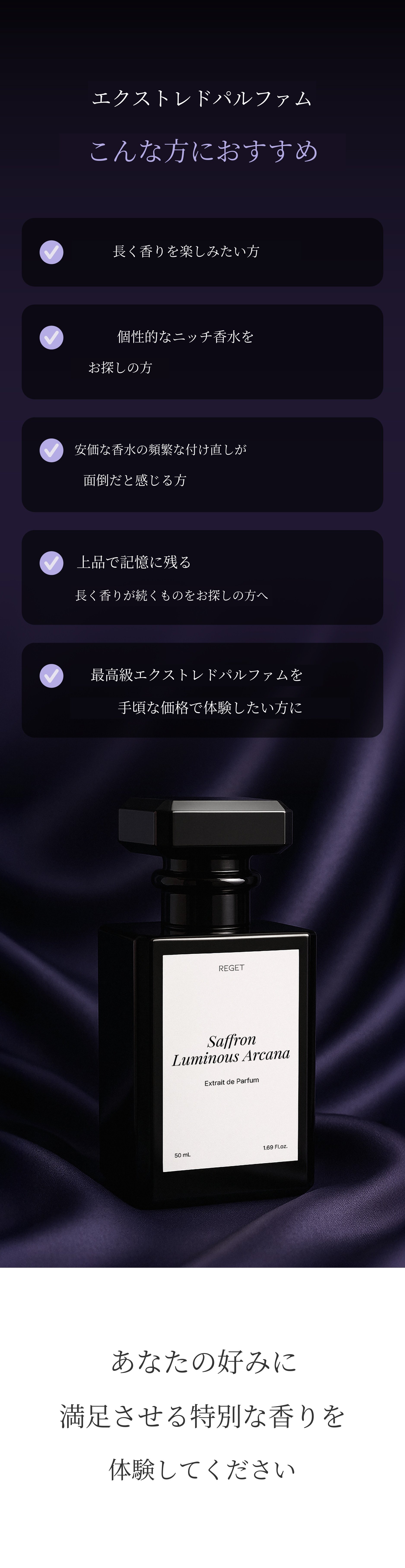 華やかではないが長く残る香り。サフラン ルミナス アルカナは、静かな歓喜のようにあなたのそばに染み渡ります。