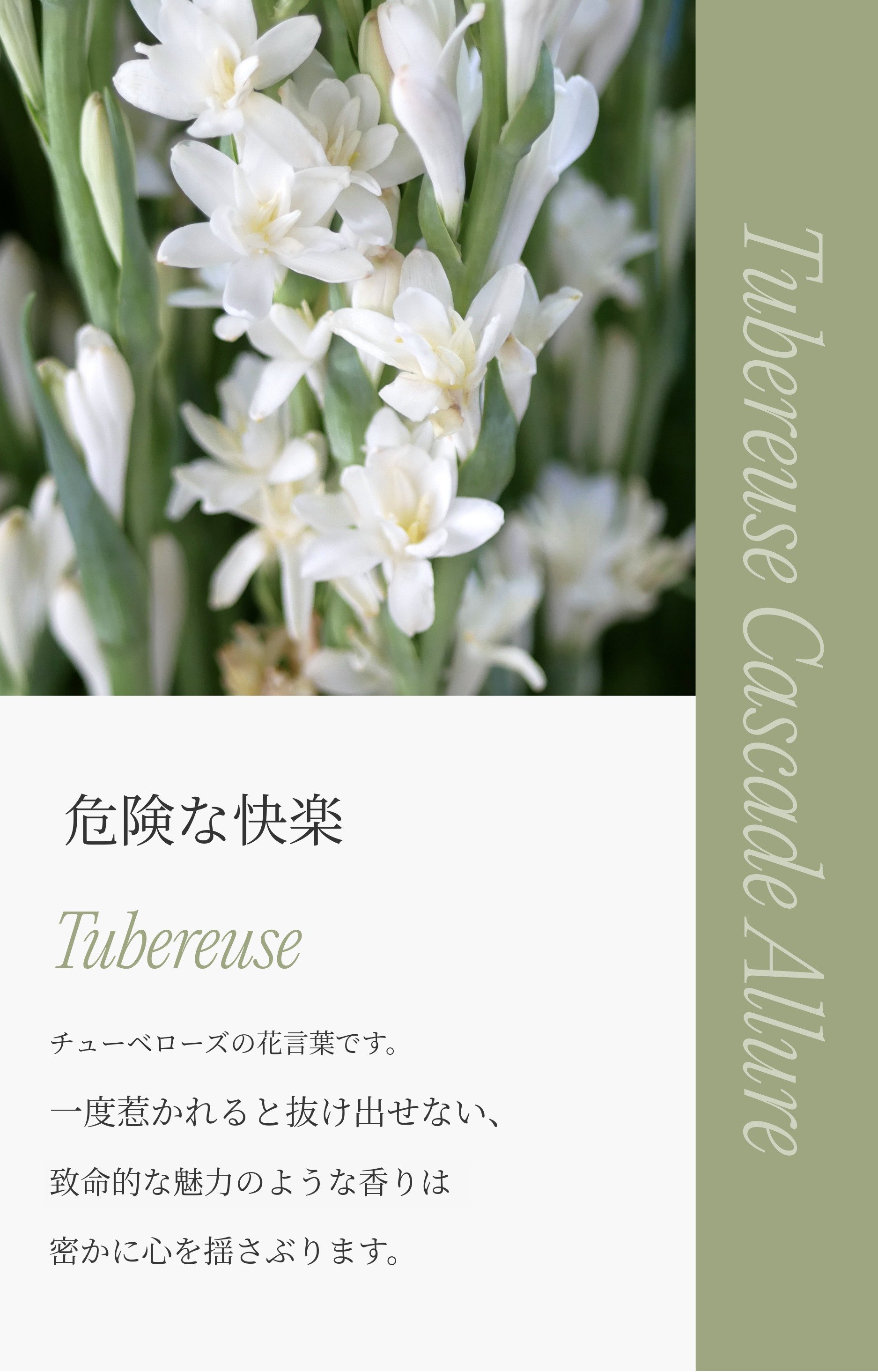 バラ、ジャスミンとともに「三大香料」と称されるチューベローズは、強烈さと優雅さを同時に持ち合わせ、夜の女王と呼ばれています。