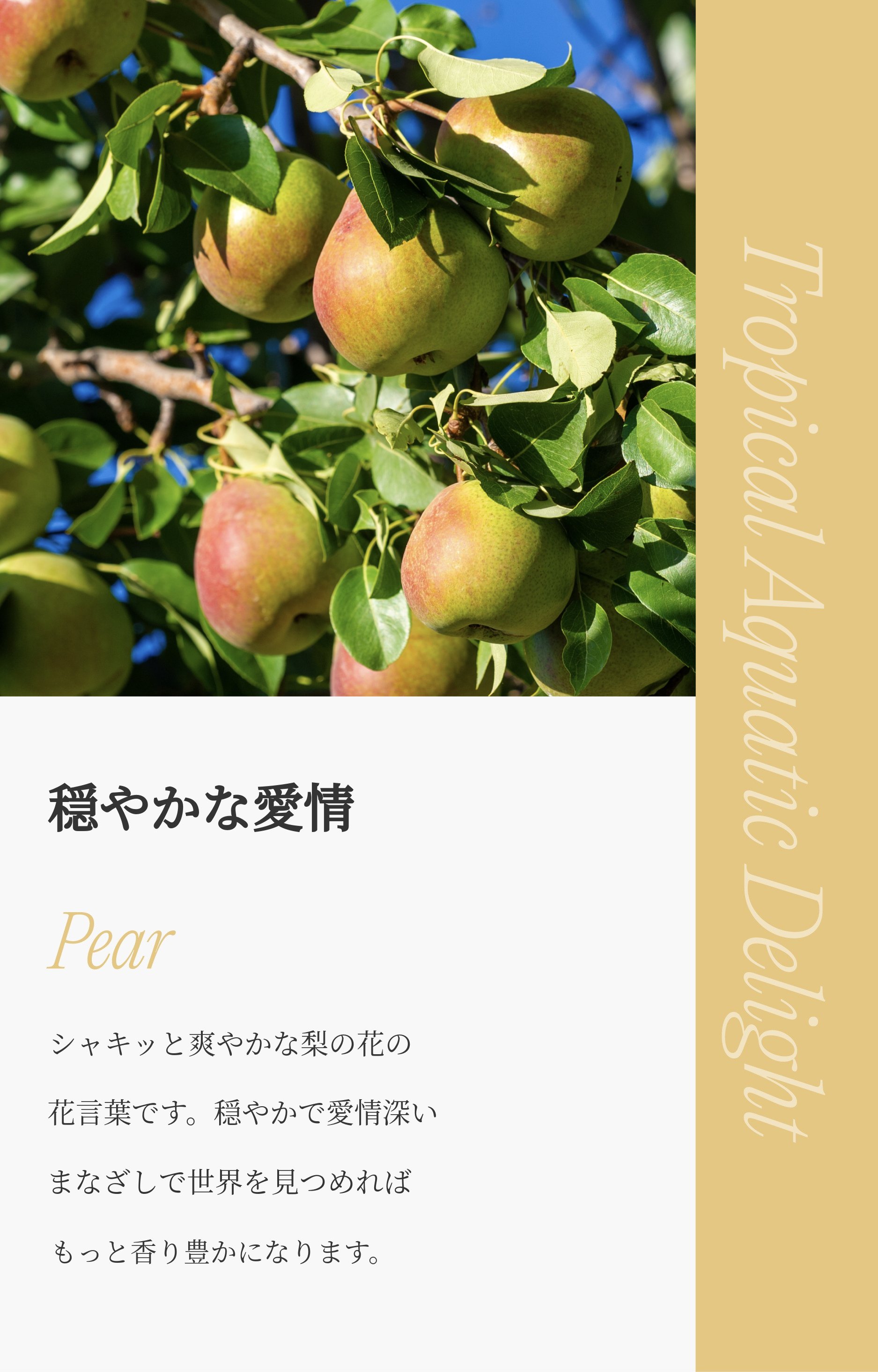 トロピカルフルーツのエネルギーとスピリットを込め、多彩でダイナミックな香りを追求しました。新鮮でシャキッとした洋梨の特徴を活かし、フレッシュで若々しい爽やかさと甘さを感じてみてください。