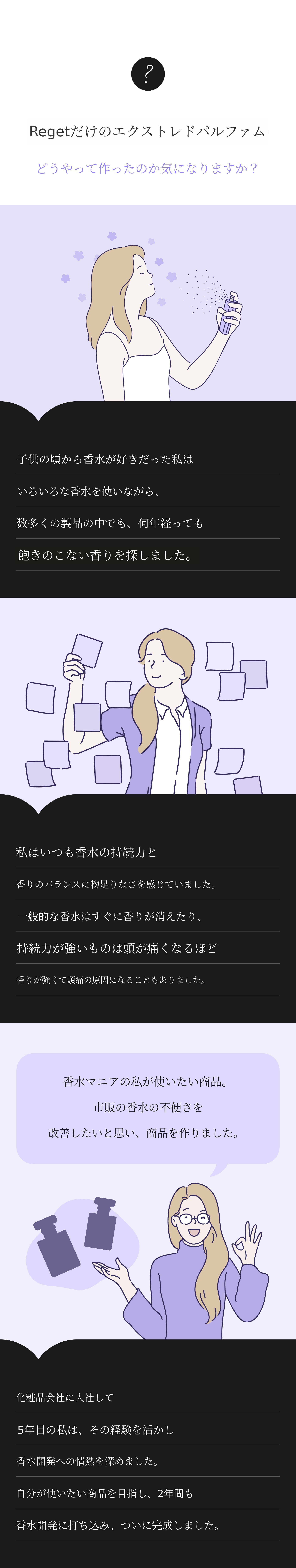 まず、今回 ファンディングを 通じて 確保した 資金で 既存 製品から 出会えなかった ことが なかった 特別で 魅力的な 香りを 継続的に 研究し 開発して サポーターの皆様の 多様な 好みに さらに 細やかに 満足させて 差し上げる 予定です。より 深く 精巧な 香りを 再現できる ことが できる 最高級の プレミアム 香料を 積極的に 活用して 製品の クオリティを 継続的に 高めてまいります。