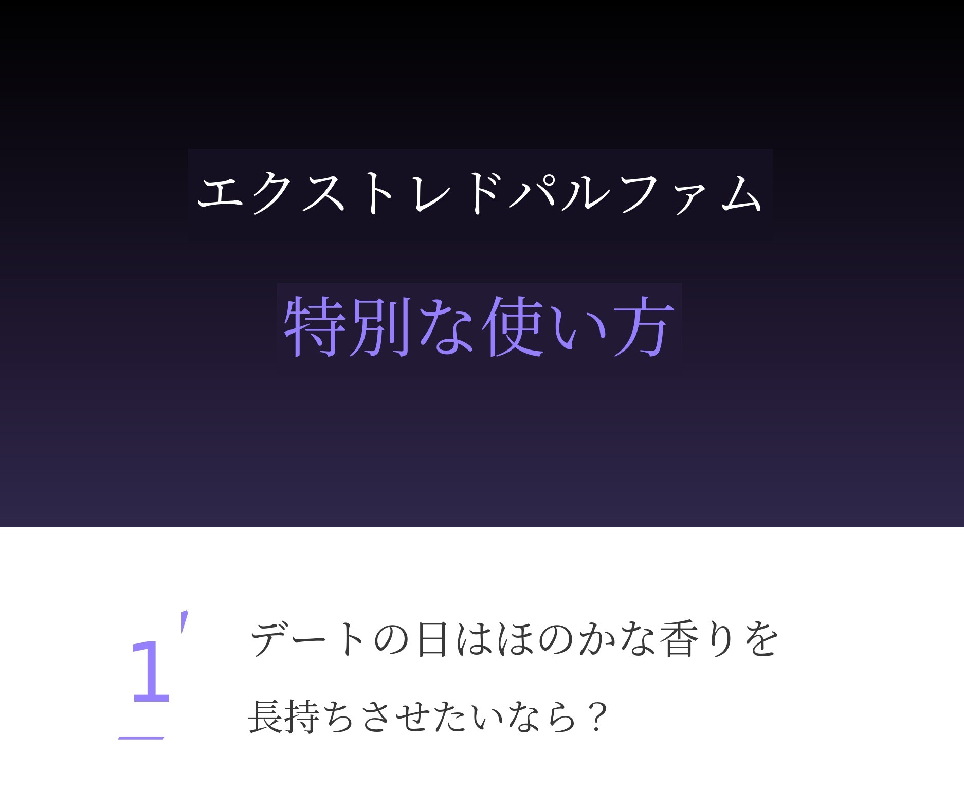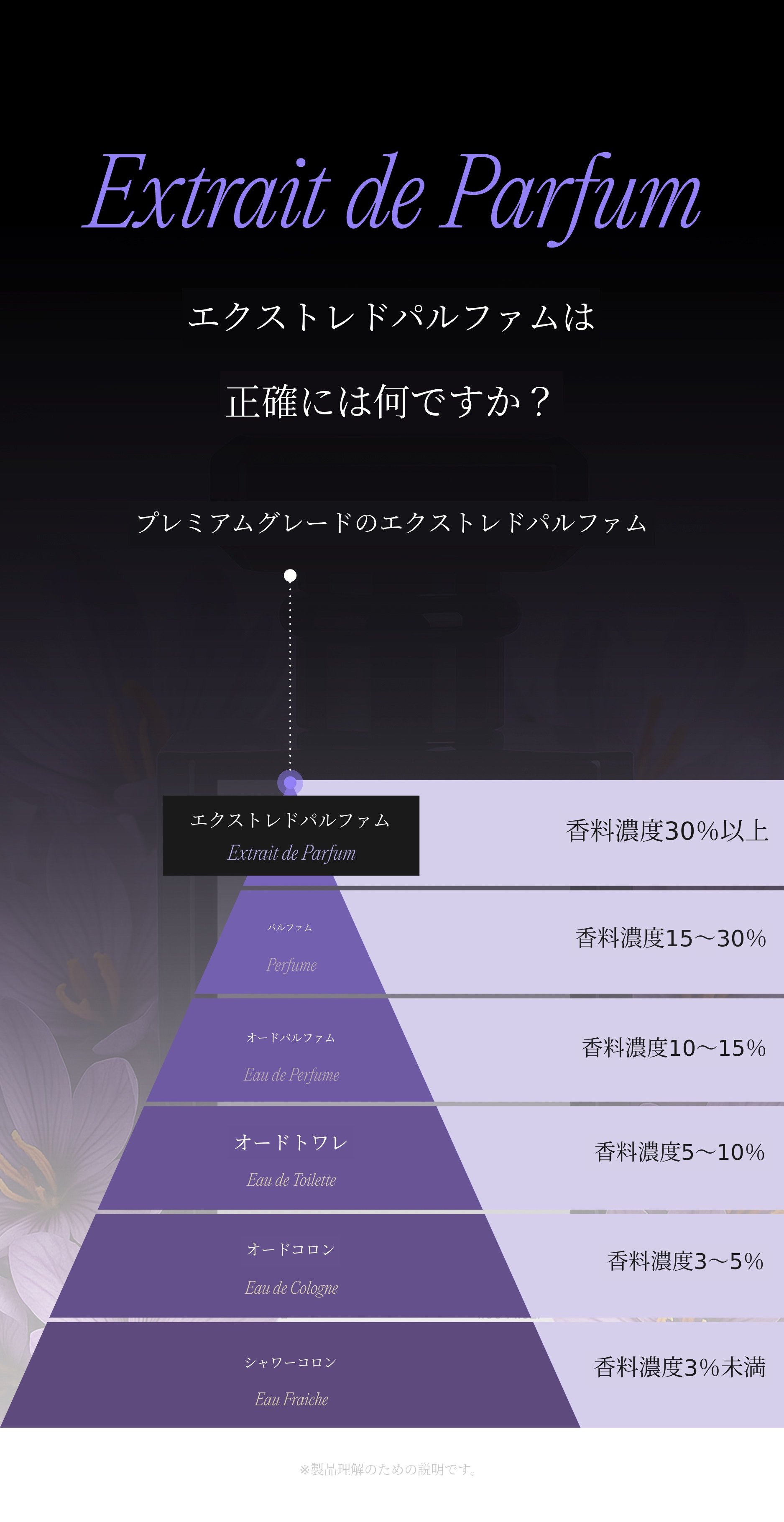 A. エクストレ ド パルファムは 一般的な オード トワレ(EDT)や オード パルファム(EDP)よりも 賦香率が はるかに 高いです。30%以上の 賦香率で、少量だけ 使っても 長く 持続して 強い 香りを 感じる ことが できます。 だから 一般的な 香水より もっと 深く 濃い 香りを 体験する ことが できます。