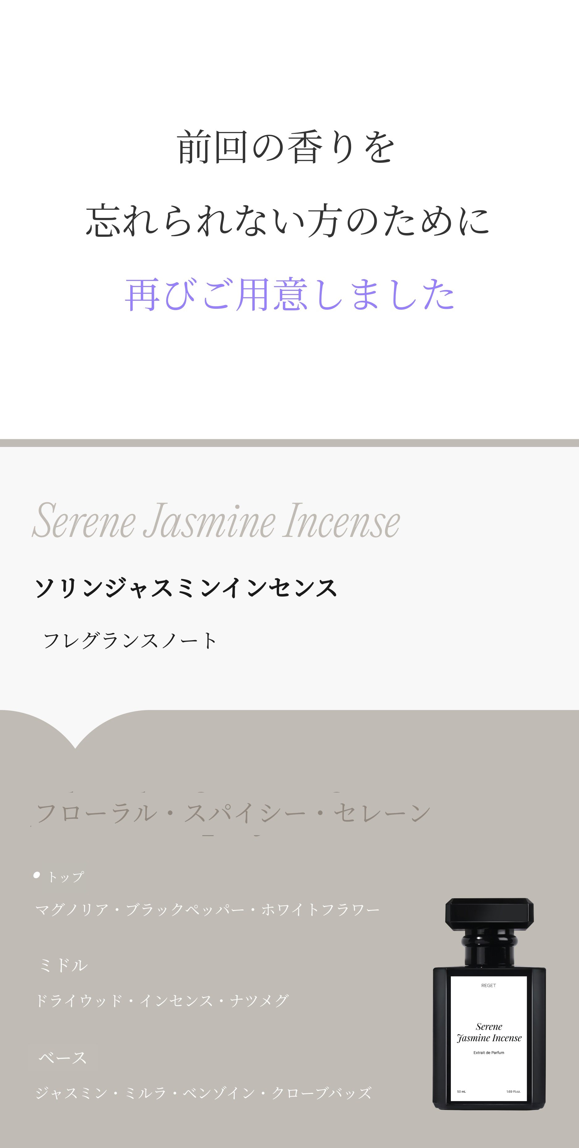 「東洋と西洋の美しいハーモニー」ほのかな花の香りとインセンスのウッディなハーモニーを体験してください。