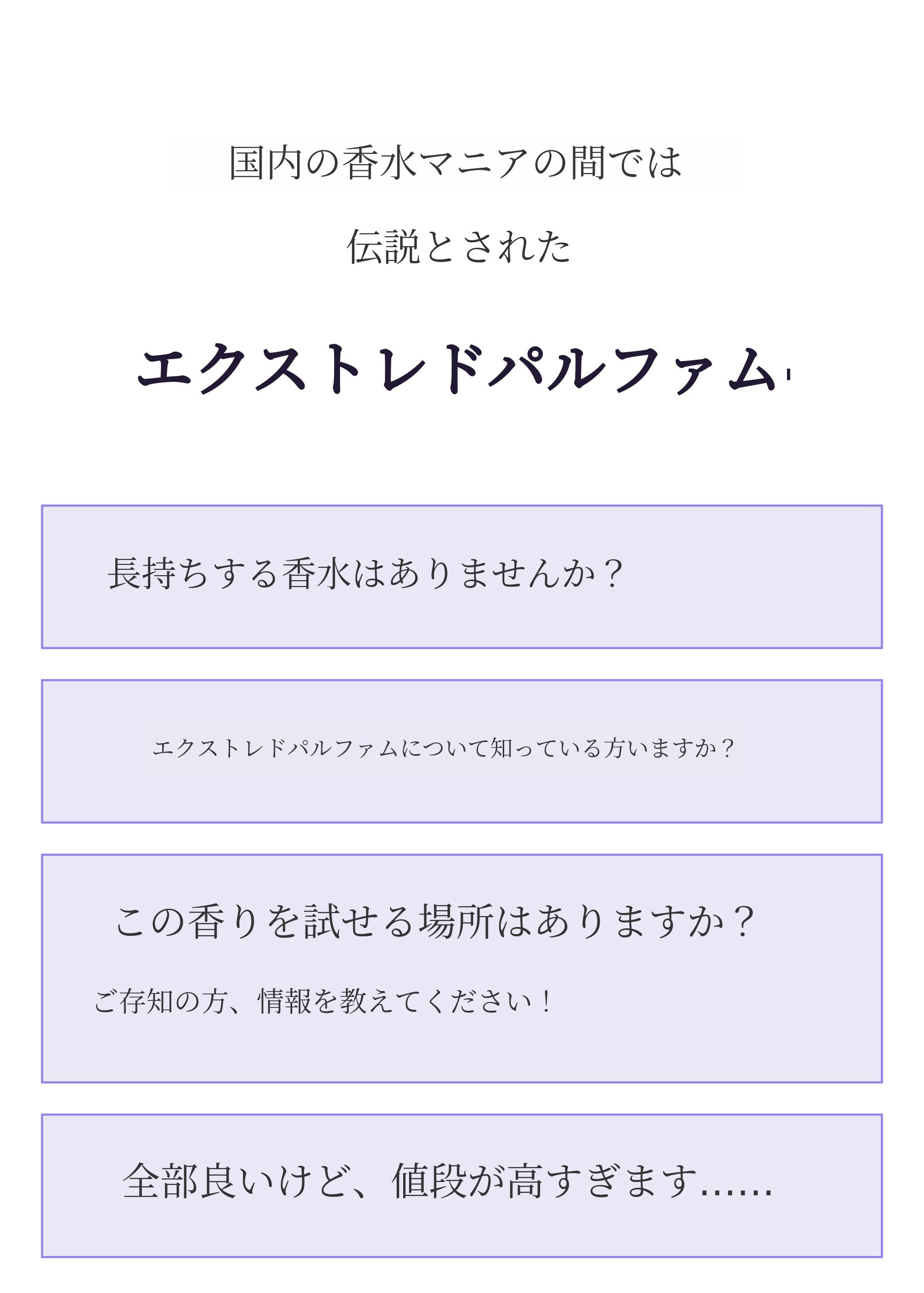 高級原料を使用し、一般的な香水の2~3倍の賦香率を持つエクストレ・ド・パルファムは、国内ブランドにはまだその製品がなく、海外でしか手に入らない希少な香水です。