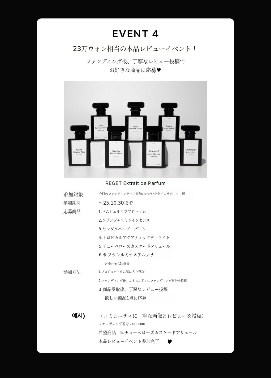 毎回 ファンディングを 進行する たびに 変わらず 送ってくださる サポーターの皆様の 温かい 関心と 応援に 心より 感謝いたします。皆様が 伝えてくださった 大切な ご意見 のおかげで 私たちは 毎 瞬間 もっと 良い 香りを 考えながら 発展し 続けて いく ことができました。