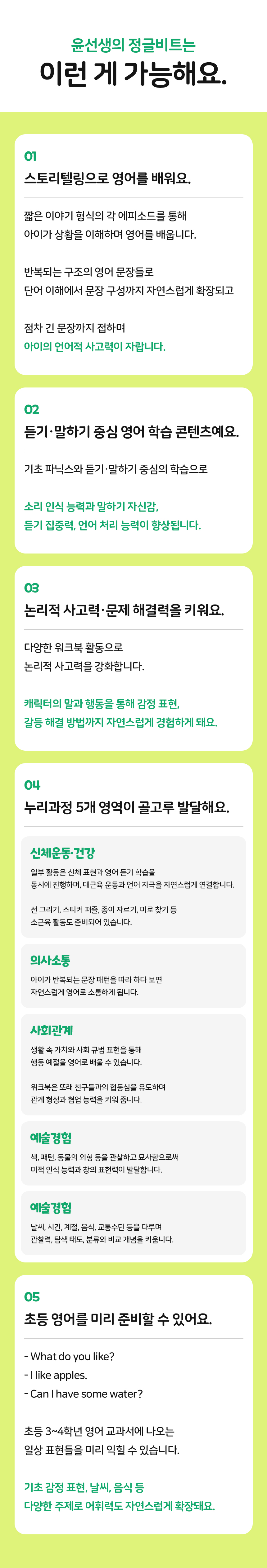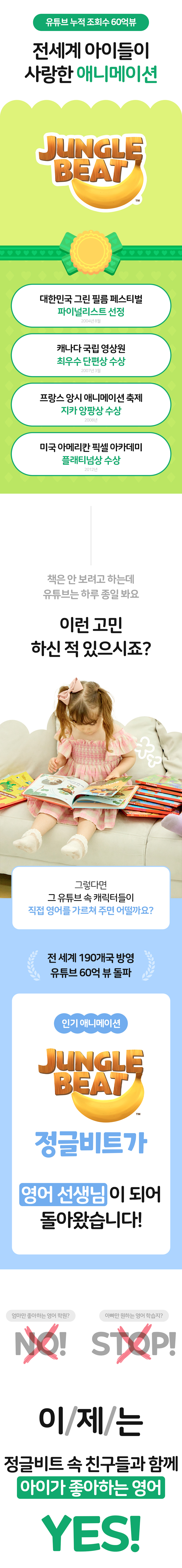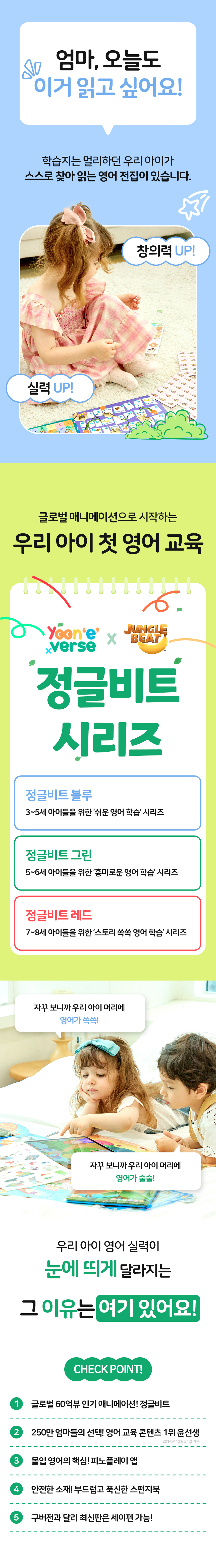 정글비트 애니메이션은 대사가 없는 슬랩스틱 코미디지만, 윤선생 정글비트 영어 도서는 캐릭터들이 영어로 실제 대화를 주고받으며 스토리를 이끌어갑니다. 이를 통해 아이들은 문맥 속 영어 표현을 자연스럽게 익히고, 몰입도 높은 학습을 경험할 수 있습니다.