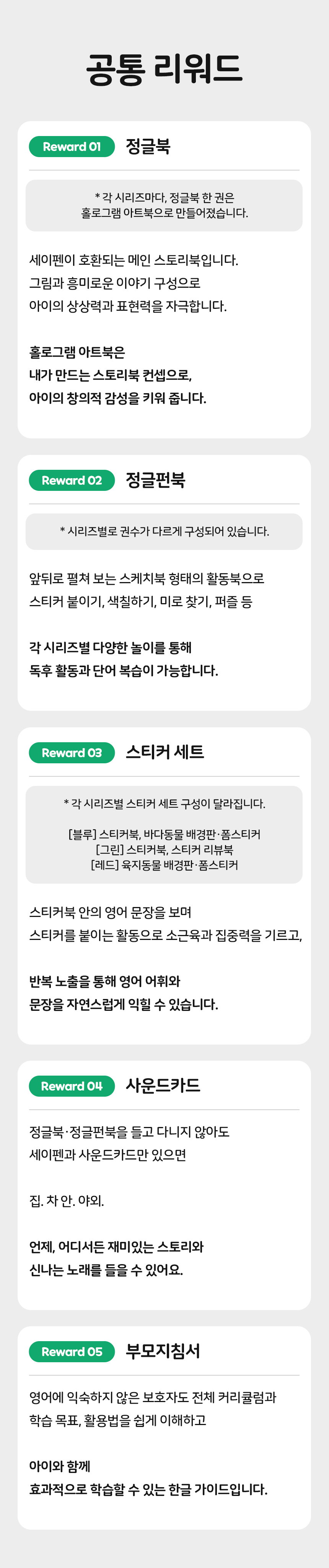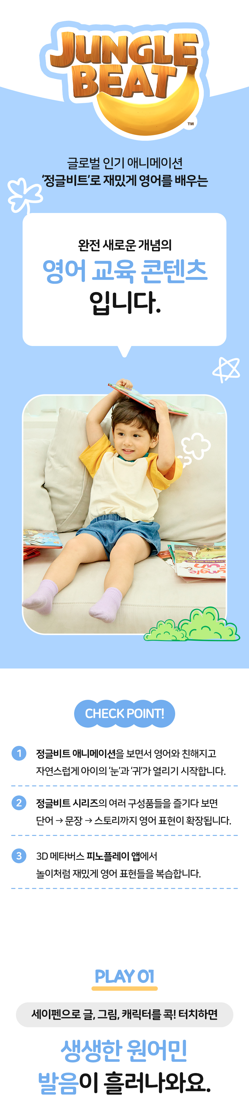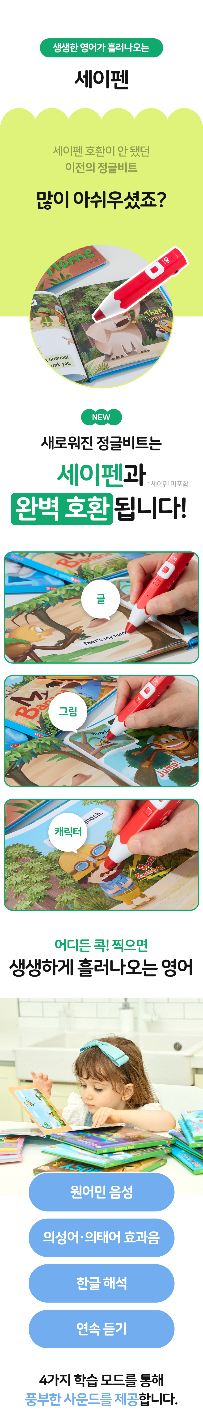 네, 이전 출시된 정글비트와는 달리 세이펜이 완벽 호환됩니다. 텍스트는 물론 그림, 캐릭터, 배경 이미지까지! 터치만 하면 원어민 음성, 의성어·의태어 효과음, 한글 해석, 연속 듣기 등 4가지 학습 모드의 다양한 사운드를 지원합니다. 아이가 스스로 듣고 따라 하며 영어를 놀이처럼 익힐 수 있습니다.