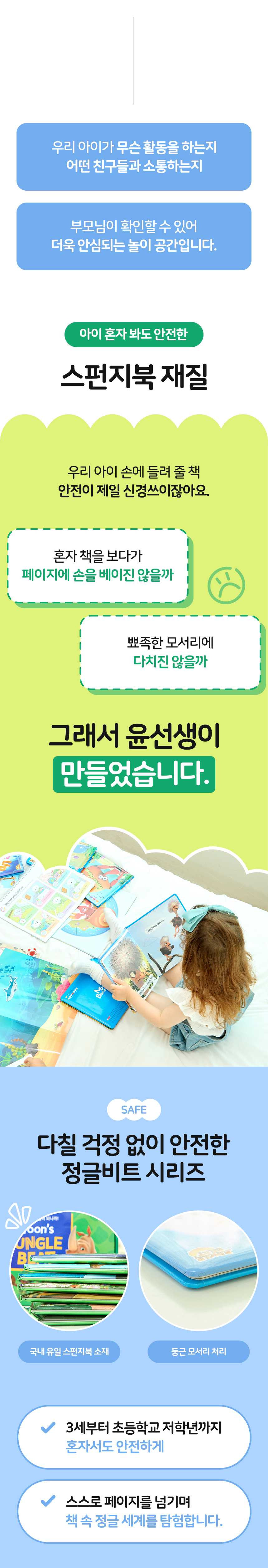 윤선생 정글비트 시리즈는 전권 스펀지북으로 제작되어, 아이가 물고 빨고 던져도 안전합니다. 둥글게 라운딩 처리된 모서리와 부드러운 재질 덕분에 유아 혼자서도 안전하게 책을 탐색할 수 있도록 세심하게 설계되었습니다.