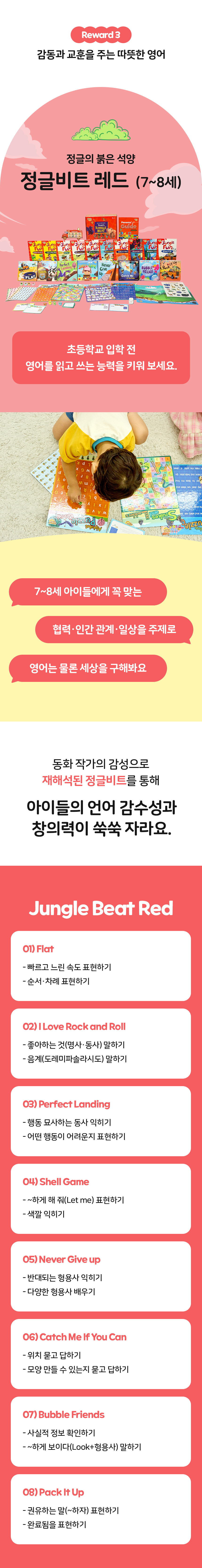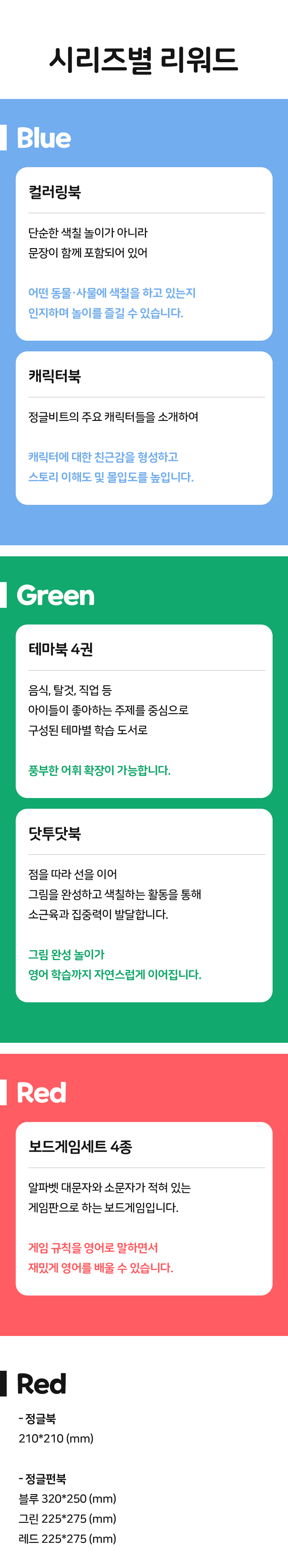 각 단계는 연령에 맞춰 블루(3~5세), 그린(5~6세), 레드(7~8세)로 구성되어 있습니다.