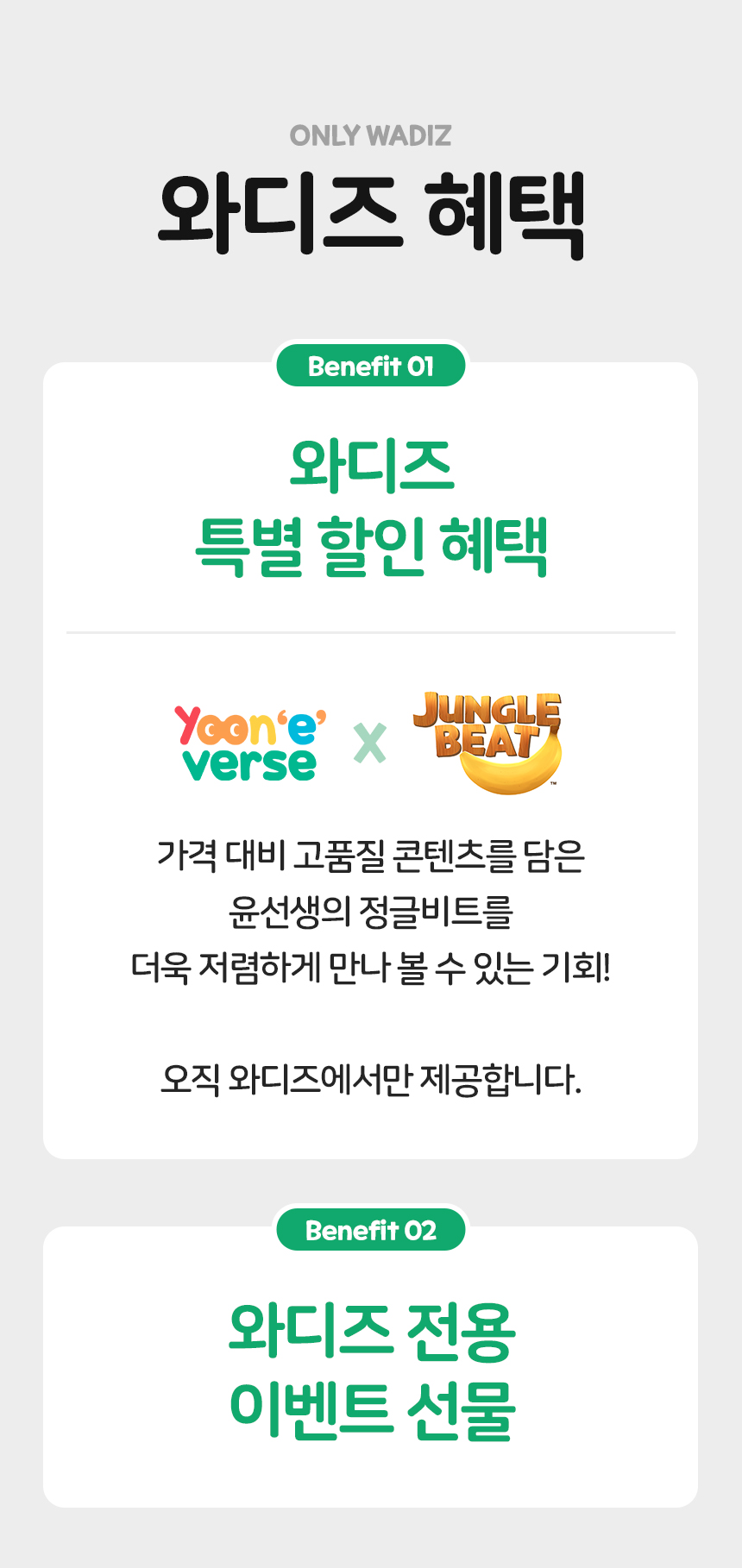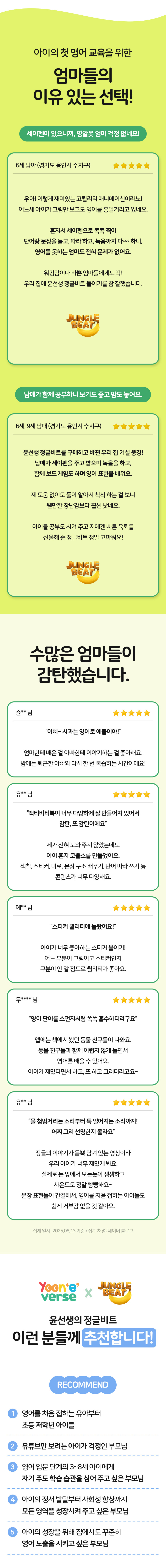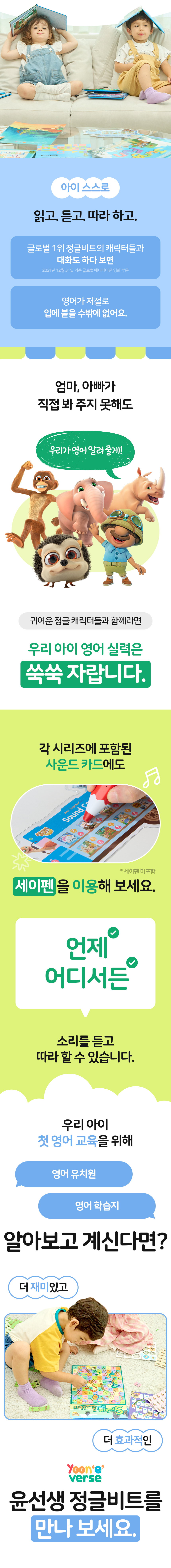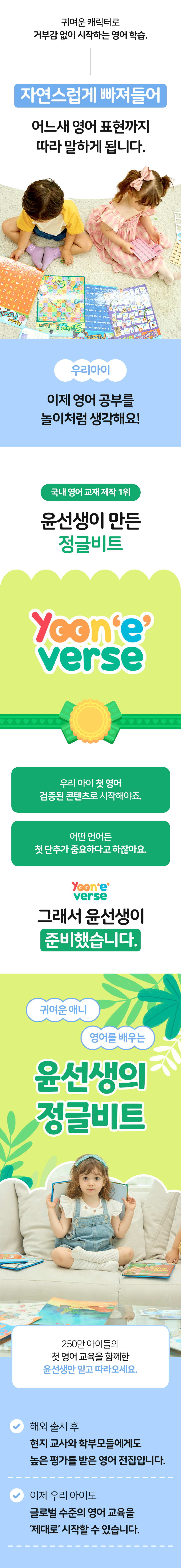 이제 윤이버스는 한 단계 더 나아가려 합니다.검증된 교육 효과와 재미를 교실에만 두는 것이 아니라, 각 가정에서도 부모님들이 최고의 영어 선생님이 될 수 있도록 그 무대를 넓히고자 합니다.