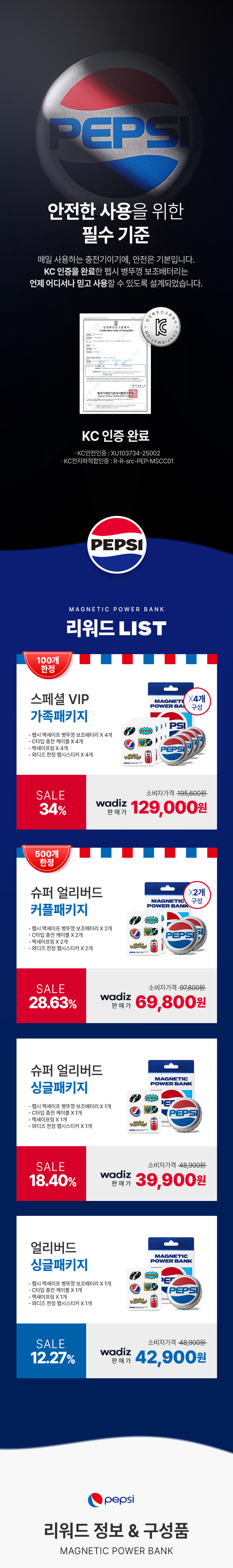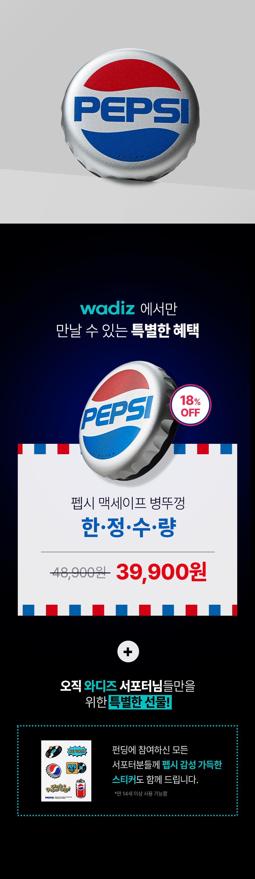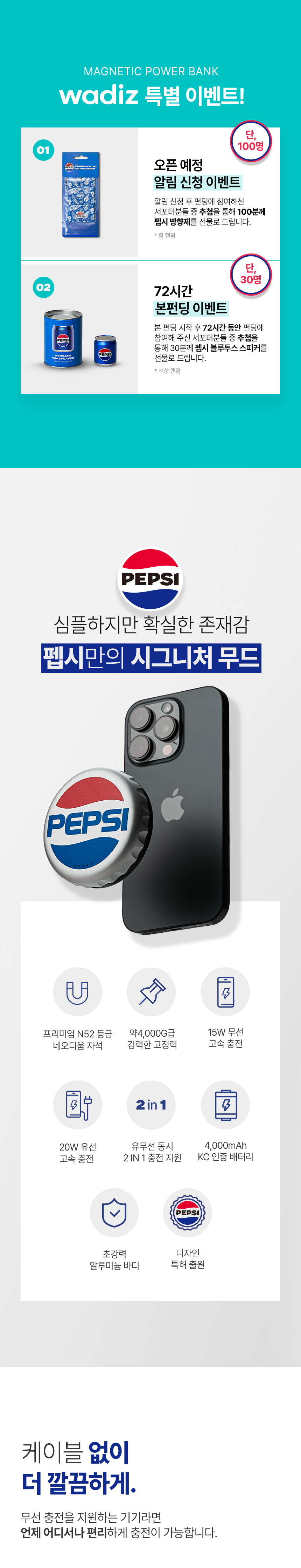 - 이번 프로젝트는 펩시 브랜드에 애정을 가진 팬들의 의견을 반영해 더욱 완성도 높은 제품을 만들고자 기획되었습니다. 와디즈는 단순한 판매를 넘어 소비자와의 소통을 통해 함께 제품을 만들어가는 플랫폼이기에, 이번 펩시 보조배터리 프로젝트에 꼭 맞는 채널입니다.