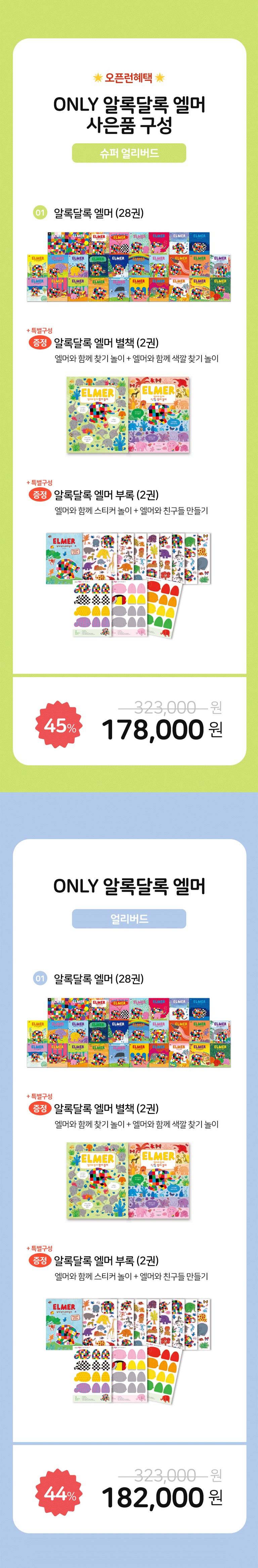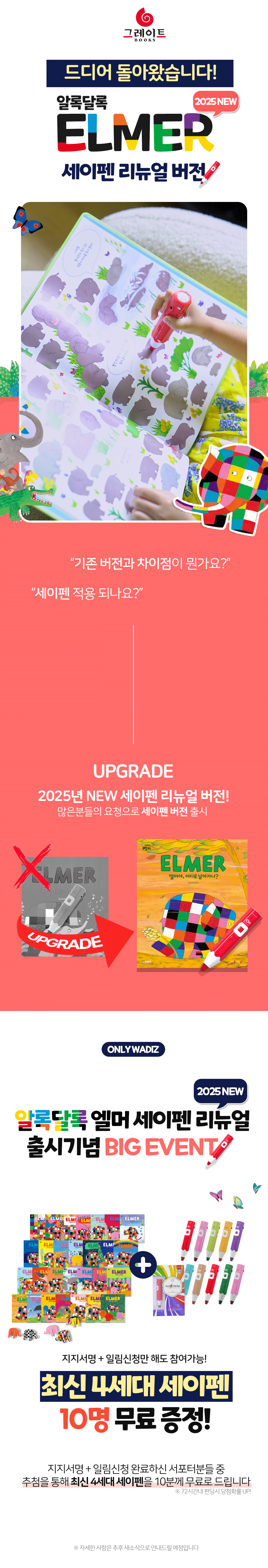 글로벌 창작도서 알록달록 엘머를 와디즈에서 처음으로 선보이며, 아이들이 다양성과 개성을 자연스럽게 받아들이고 표현할 수 있도록 돕는 따뜻한 이야기와 감각적인 일러스트를 함께 전합니다. 전 세계적으로 사랑받는 엘머 시리즈를 통해 단순한 독서를 넘어, 아이의 감수성과 상상력, 사회적 공감 능력을 키워주는 특별한 독서 경험을 선사하고자 합니다.