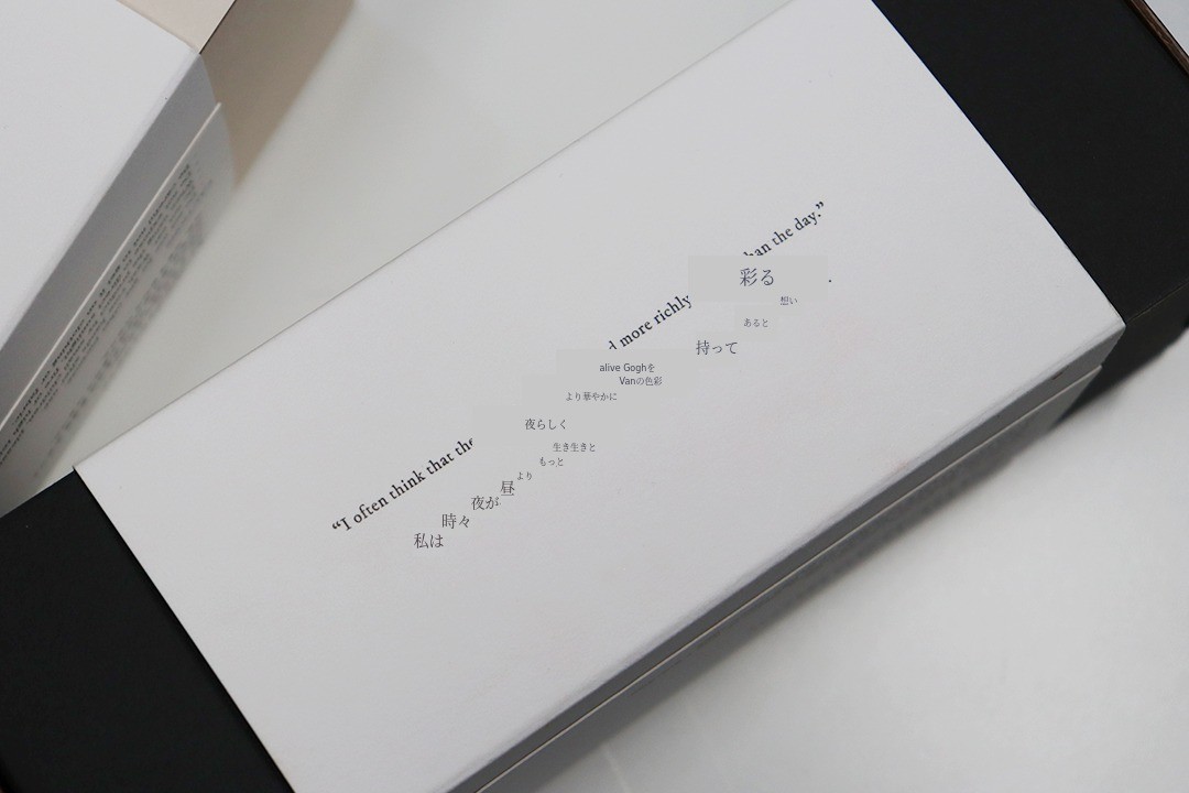 ローヌ川沿いに広がる空と水面の光をイメージし、ゴッホが残した風景の中の澄んで深い昼の清涼感を込めました。清らかな青い光が波のように広がるトーン。ほのかなパールが水面の陽射しのように輝きます。