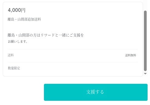 離島・山間部にお住まいの方は本品リワードと一緒に離島・山間部送料を追加で選択していただければ結構です。簡単に追加できるよう、リワード下部に別途ご用意しております。