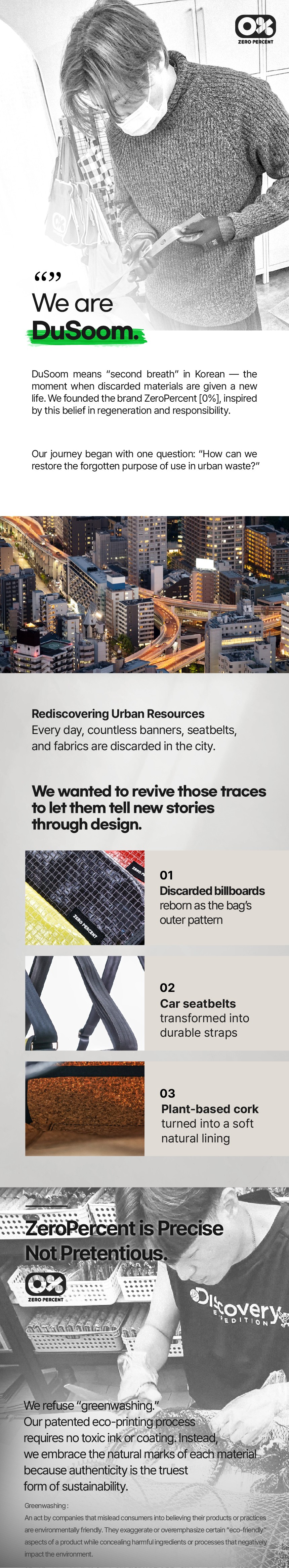 ZeroPercent [0%]では、これらの資源を自ら収集し、特許取得済みの無害なアップサイクル技術で処理しています—このプロセスでは化学染料もコーティングもグリーンウォッシングも一切ありません。素材サイクルの最初から本物のサステナビリティを実現しています。