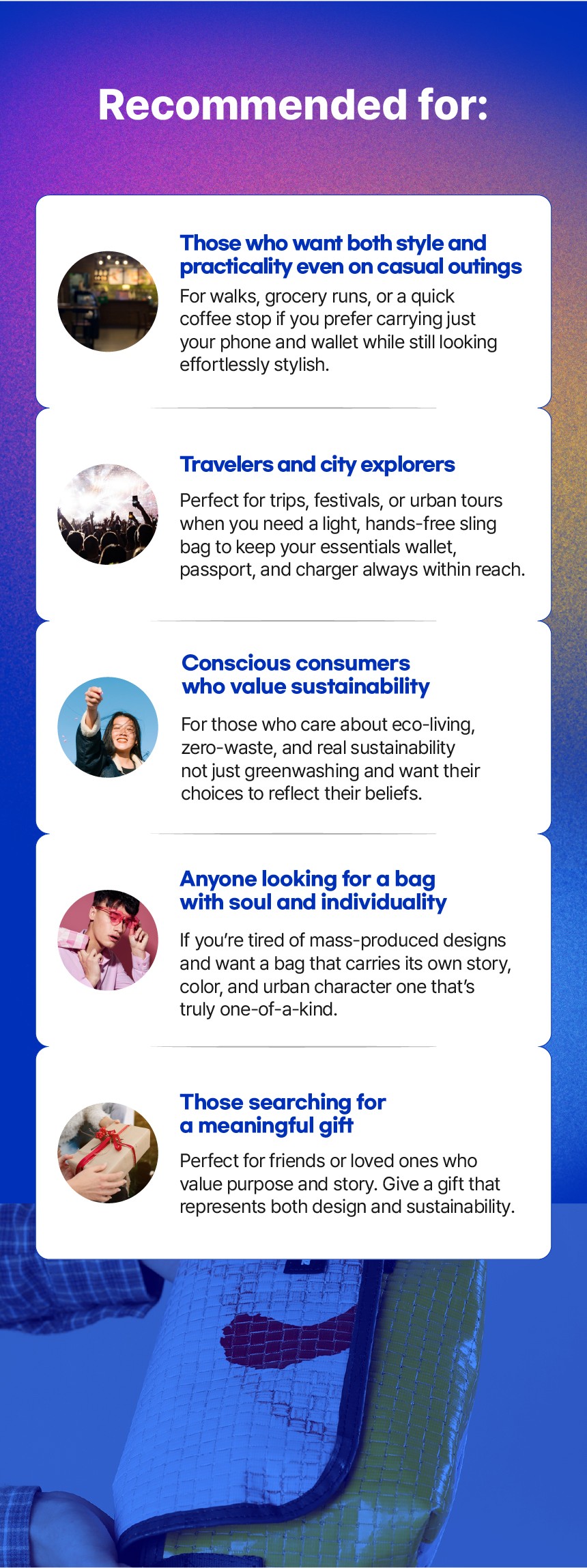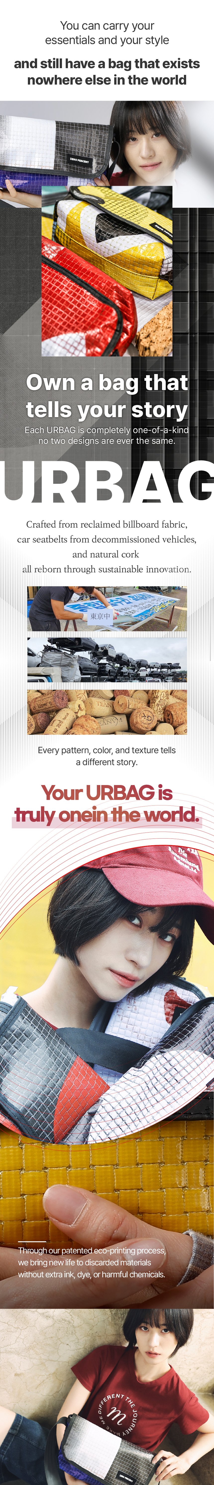 すべてのURBAGは唯一無二です—なぜなら、同じ物語を持つリサイクル素材は二つとないからです。