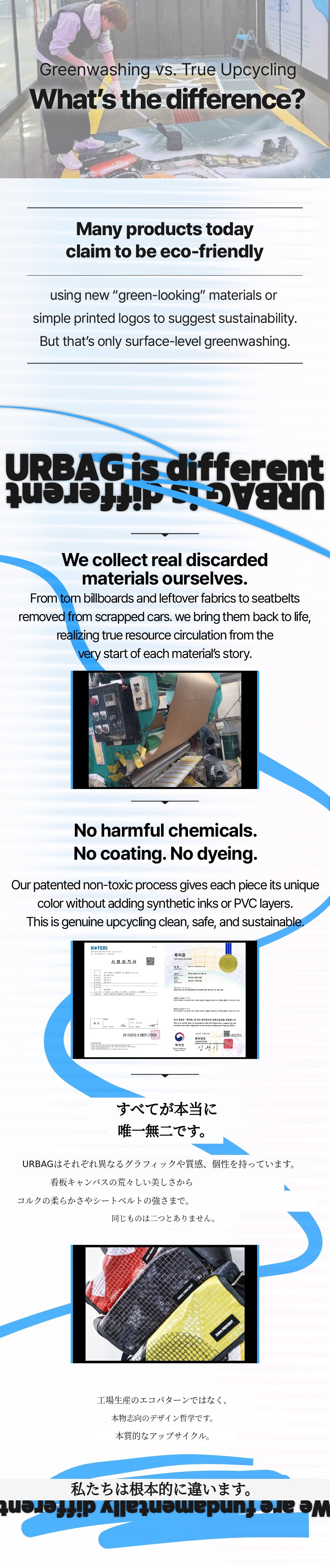 多くの「エコフレンドリー」と称される製品が新しい生地を使ったりグリーンラベルを付けたりするだけなのに対し、URBAGは本物のリサイクル素材から始まります。