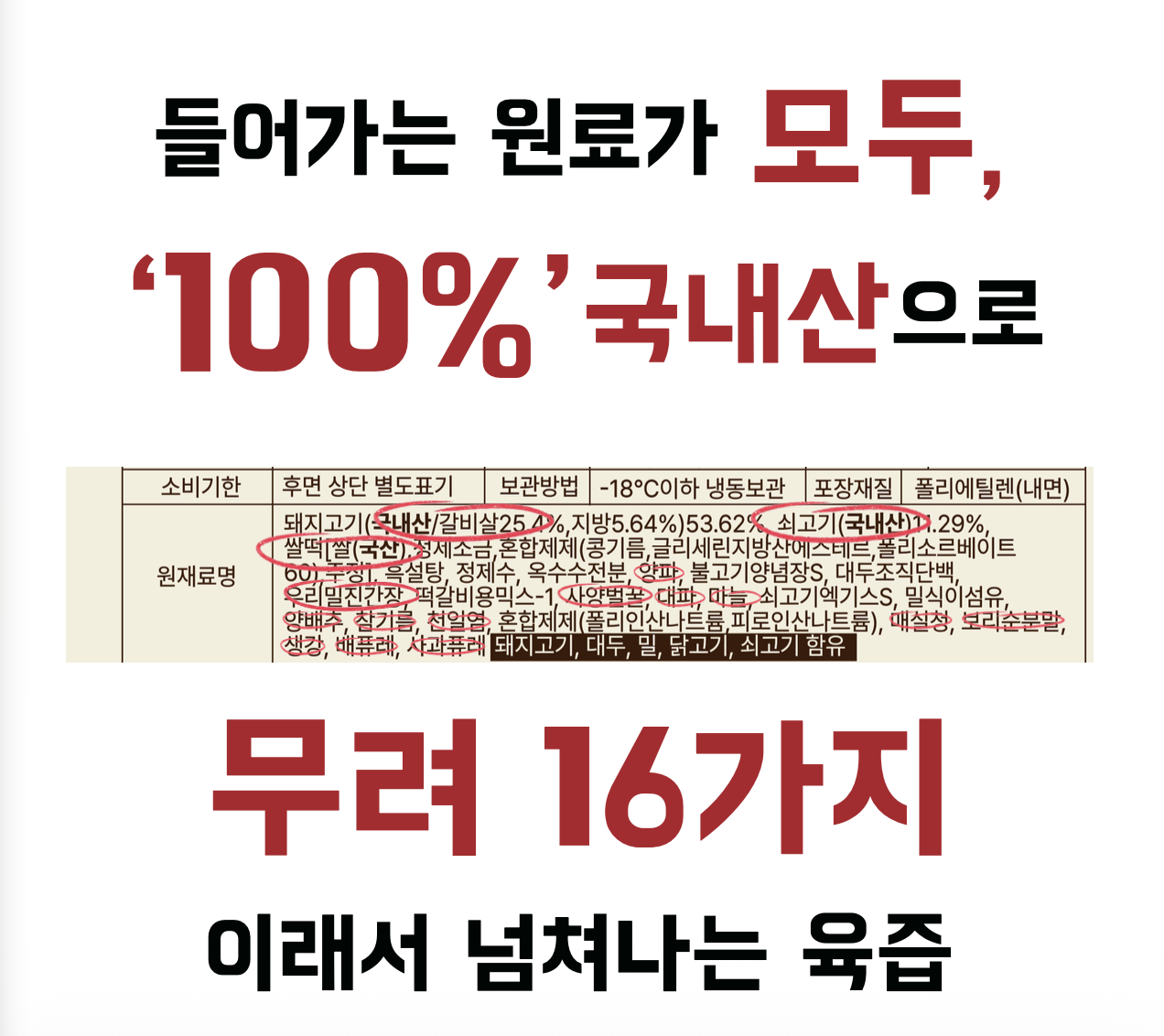 하나 빠지지 않고 모든 원재료를, 우리 땅에서 자란 100% 국내산입니다. 제품을 만들기전부터 오로지 국내산 원료만 생각하고 만들었습니다. 얼마나 많은 국내산 원재료가 들어가 있는지 볼까요?