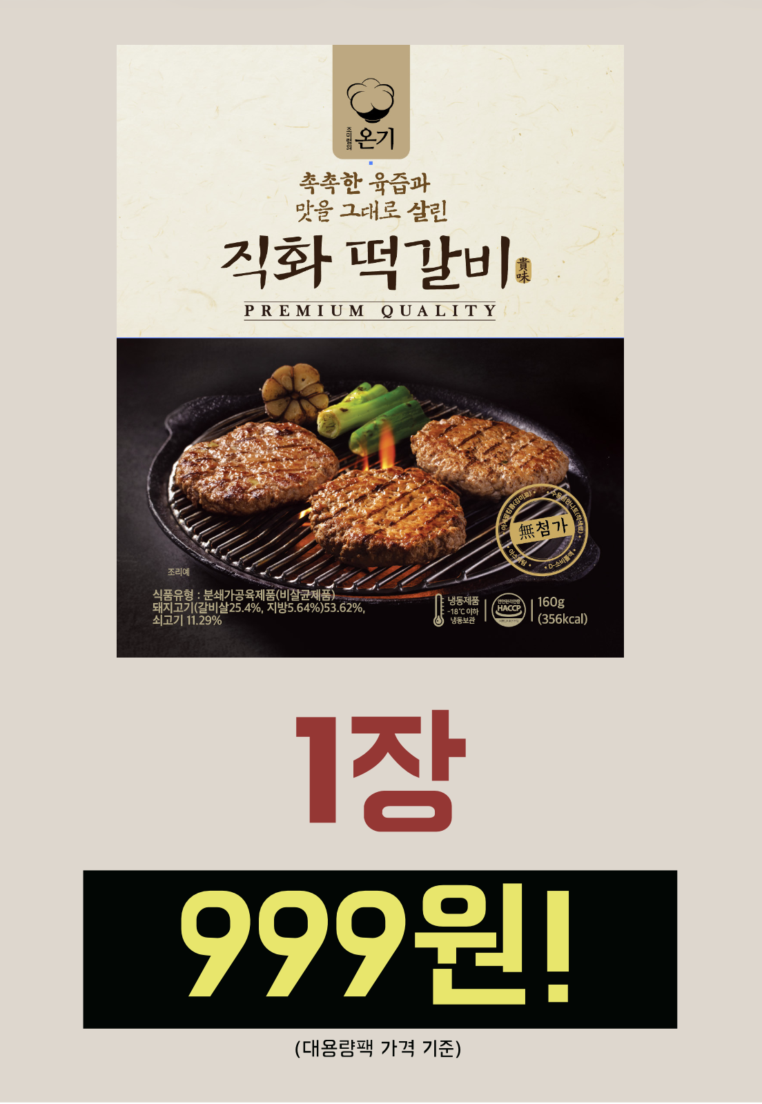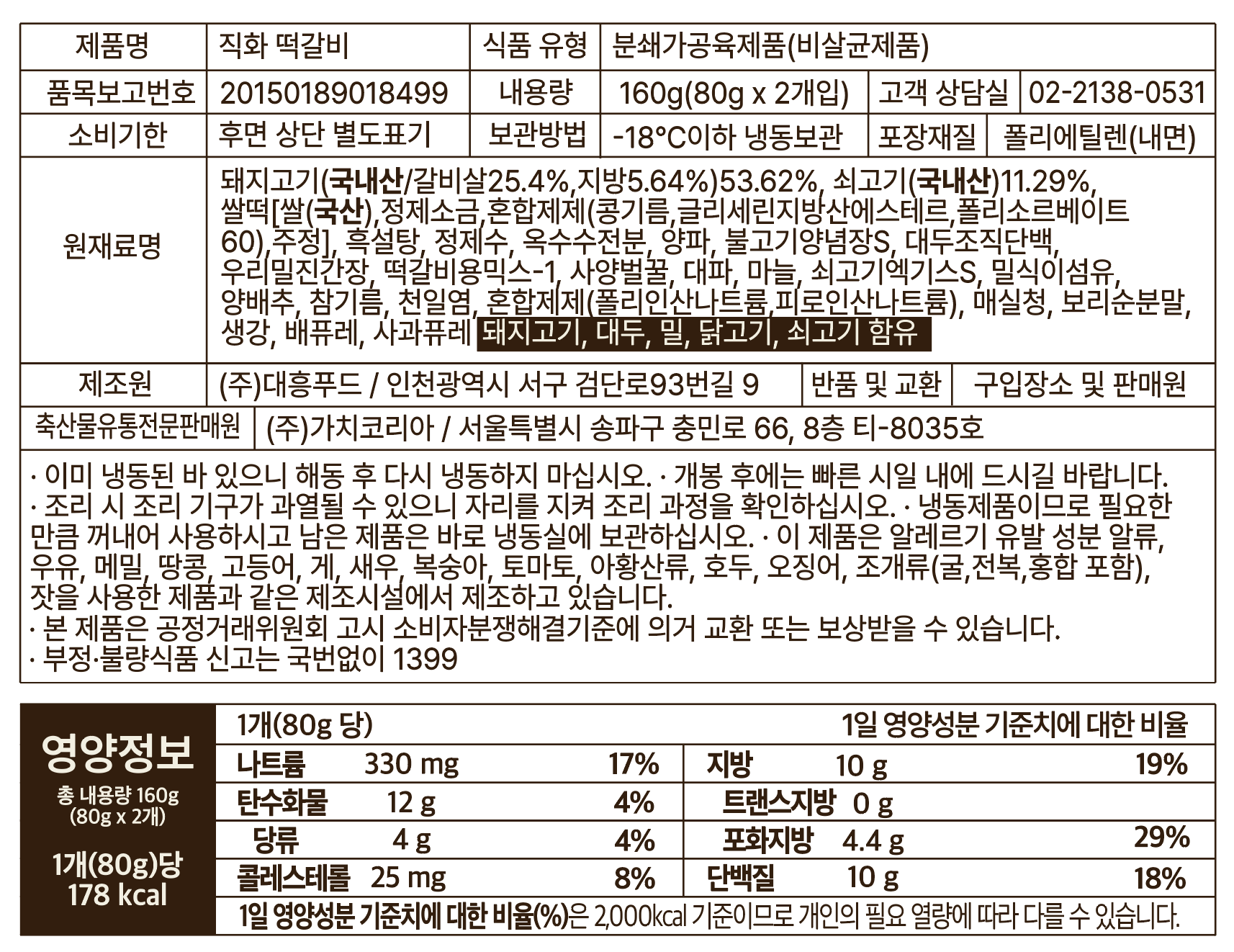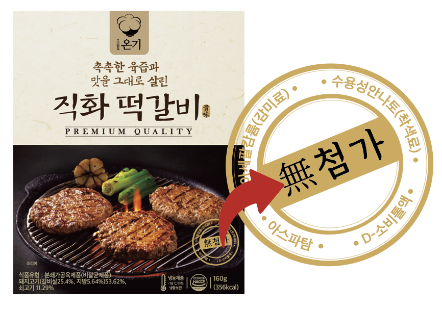 패키지에서도 확인하세요. 인공 색소 대신 원재료 그대로의 자연스러운 색을 살렸습니다. 인공 감미료를 넣지 않고 매실청과 벌꿀로 자연스러운 단맛을 냈습니다. 직화떡갈비는 설사 등 위장 부담을 줄이고 편하게 즐길 수 있는, 아이부터 어른까지 온가족이 안심하고 먹을 수 있는 건강한 떡갈비에요.