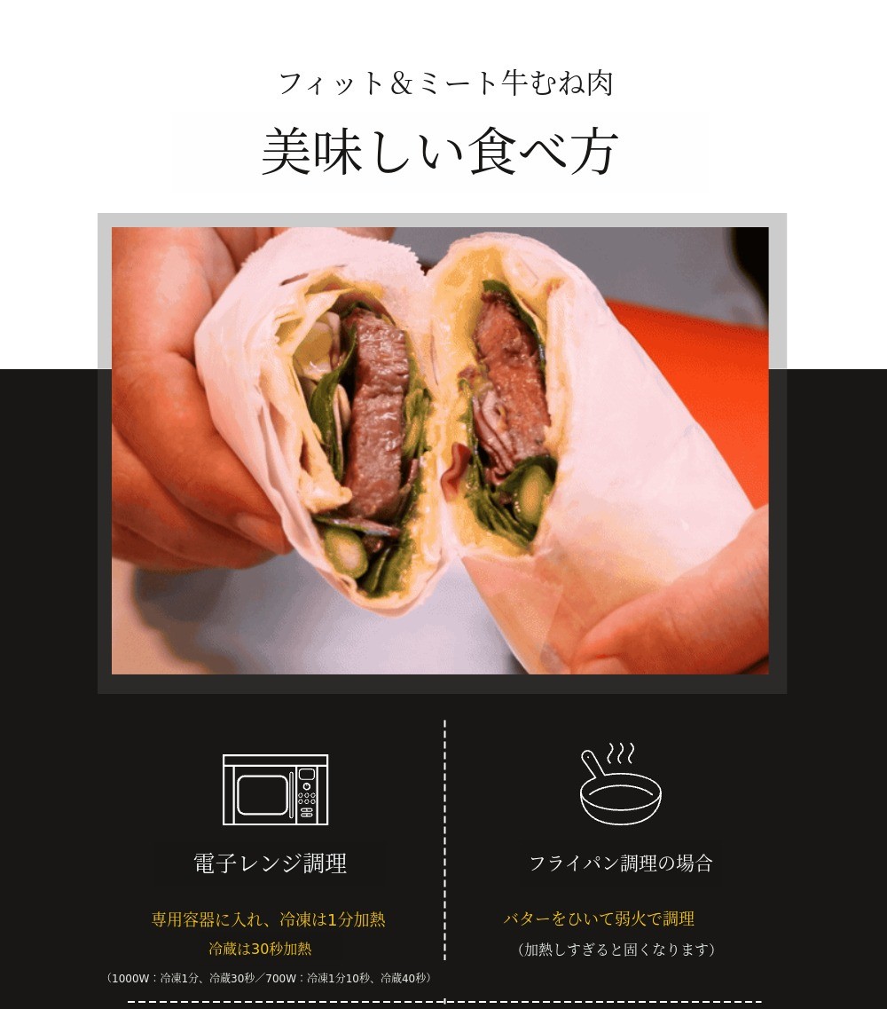 フィット&ミートが作ったプレミアム牛胸肉はパサつきをなくし、しっとりと仕上げてまるで高級なヒレステーキのようです。とろける牛肉の柔らかさと、噛むほどに広がる香ばしい風味をお楽しみください!
