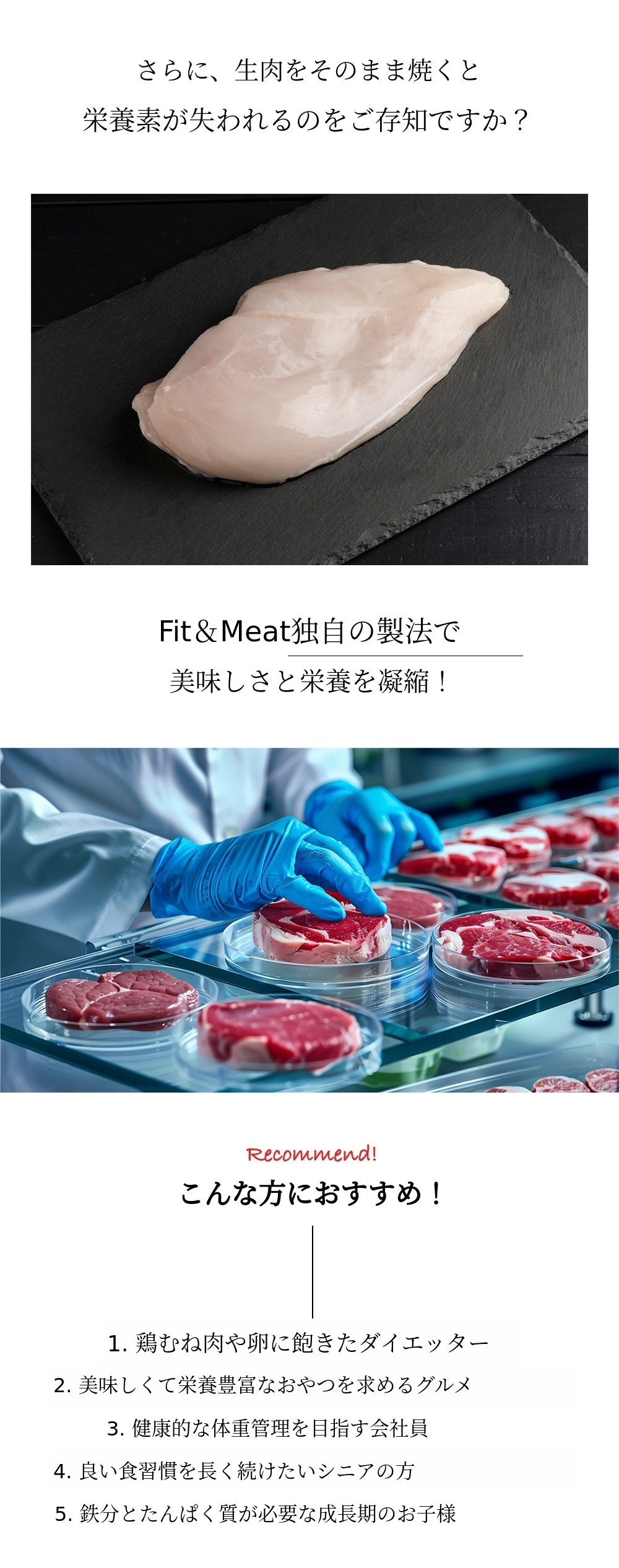 フィット&ミートは「炭火で焼いた肉が一番美味しい」という哲学のもと、肉本来の風味を最大限に引き出し、味と栄養の両方を兼ね備えた肉製品を開発しています。手作りで製造を行い、燻製香辛料ではなくフィット&ミート独自の特別な製法による燻製で栄養成分をそのまま凝縮し、アミノ酸を増やして肉の栄養価を高めています。