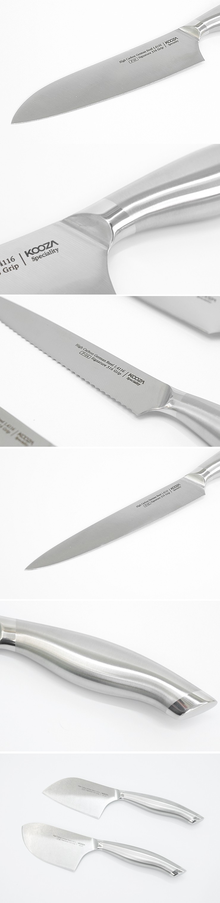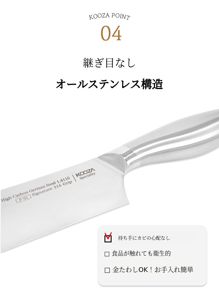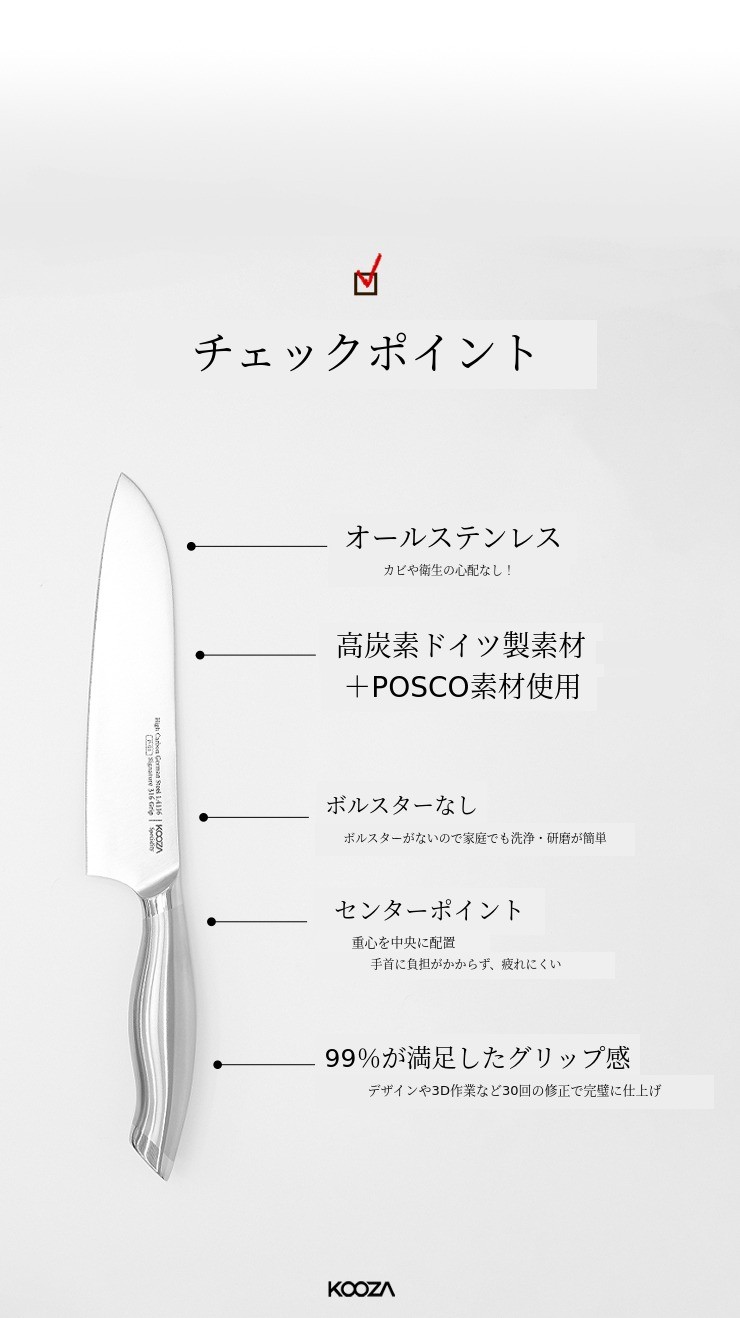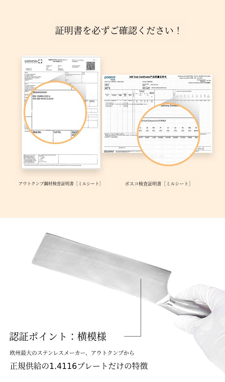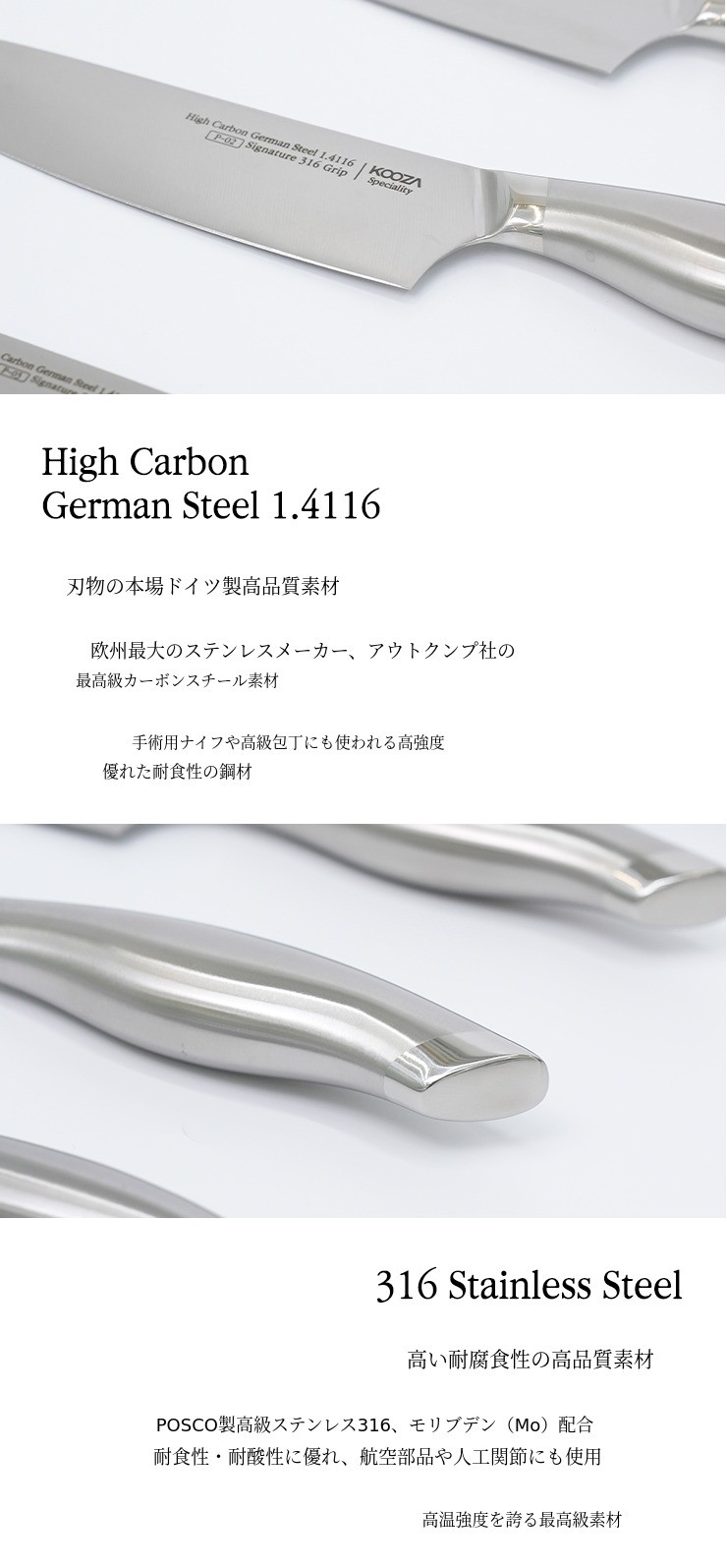 ヨーロッパ最大のステンレス生産会社アウトクンプ(Outokumpu)の最高級炭素鋼を誇る1.4116の素材 を使用して刃 を製作し、モリブデンが添加され耐食性と耐酸性に優れたポスコの316ステンレスを使用してグリップ を製作しました。