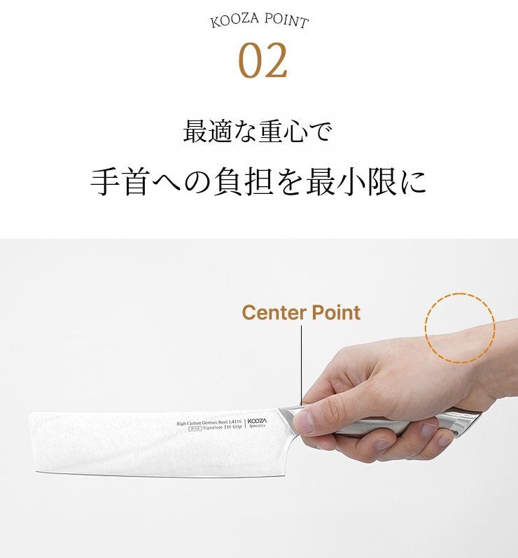 ハイスペック素材の良い包丁は本来ずっしりとした重みを感じるのが一般的です。しかし、ユーザーの利便性のためにグリップに関する長い研究と何十回もの修正の末に「重さが軽く感じられる」グリップ を完成させました。実際の重さよりもはるかに手首への負担が少なく、軽く感じられるでしょう。