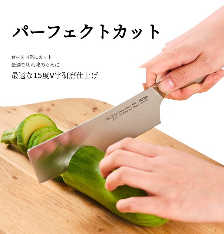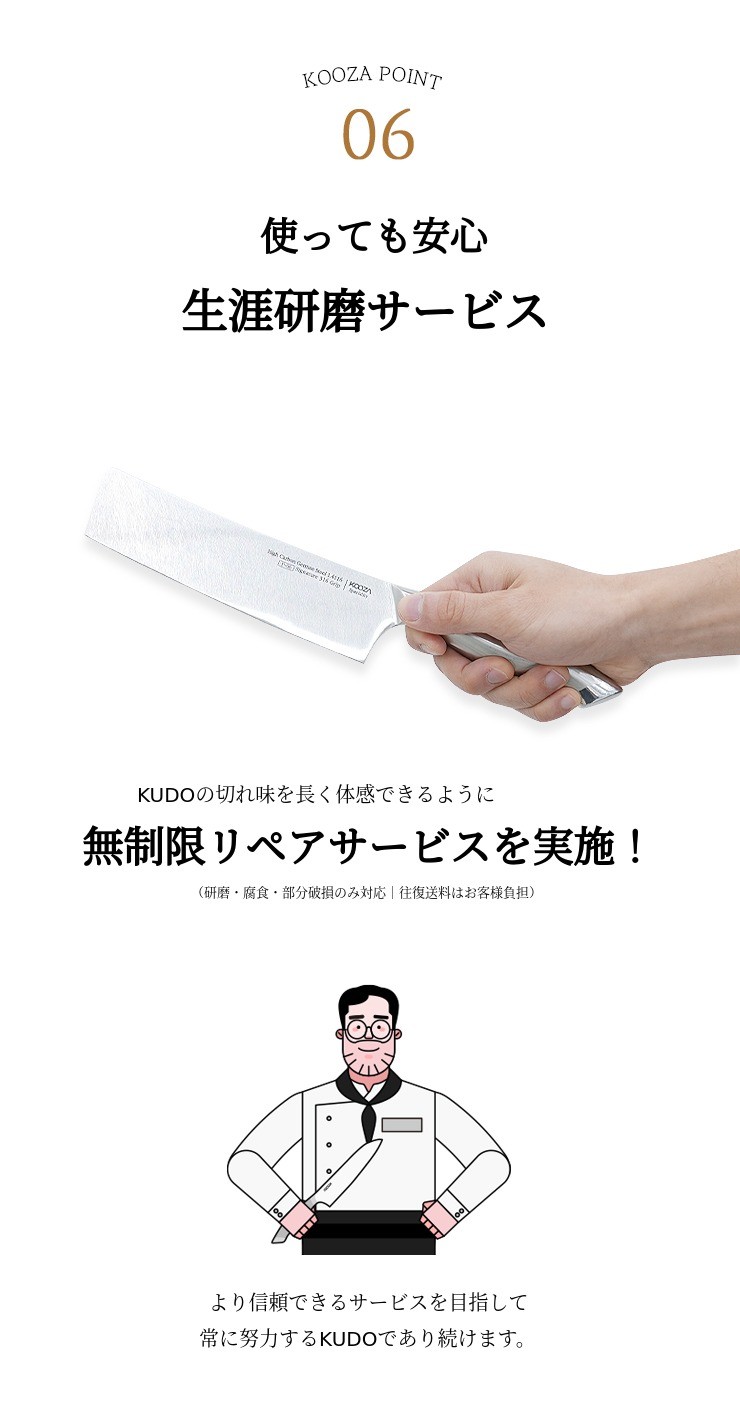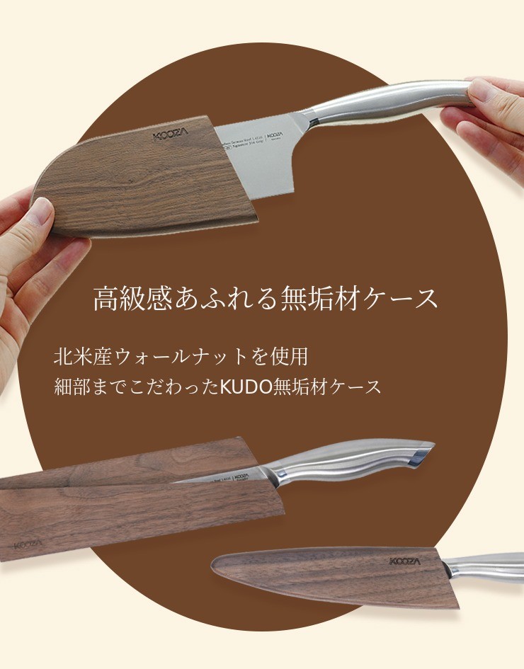 クドは有名ブランドのナイフと比べても自信のある最適な硬度58で製作されており、15度V字研磨作業 まで完了し、食材を自然かつ簡単に下ごしらえできます。さらにクドは持続力と靭性、そして研ぎやすさまで考慮して製作しました。ご家庭で簡単かつ便利に管理してご使用いただけます。