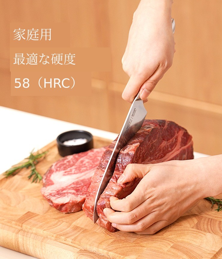 硬度は簡単に言えば切れ味の持続度を示します。硬度が高すぎると刃こぼれしやすく、低いと刃がすぐに鈍くなります。また、良い硬度は良い素材と技術力が揃ってこそ実現できます。