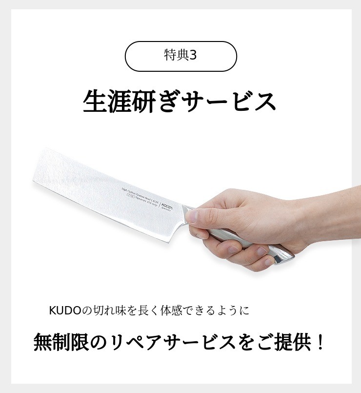 クドをご利用のサポーターの皆様ならどなたでも生涯無制限リペアサービス を受けられるようにご用意しました。鈍った刃の悩みはもう終わり! クドとの出会いで、終わりのない心地よい切れ味を体験してください。