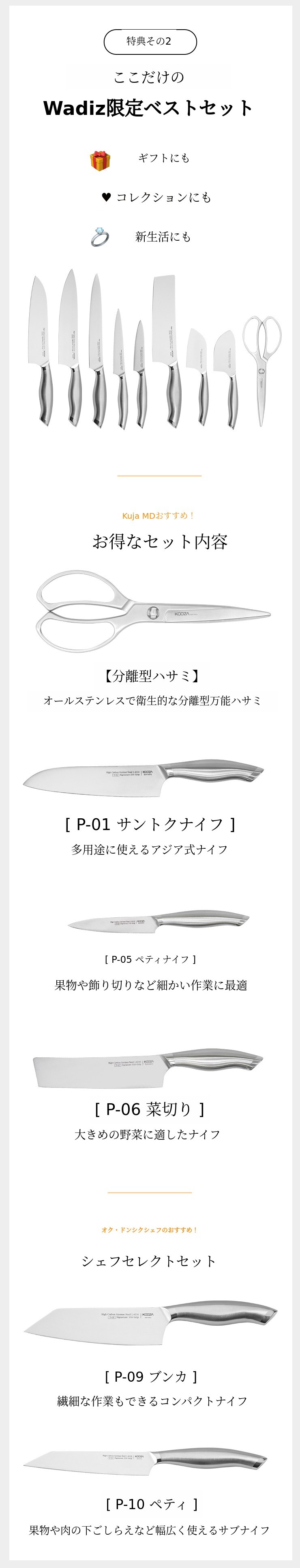 クド初のフルセット、種類ごとに一本ずつ包丁をご覧ください。