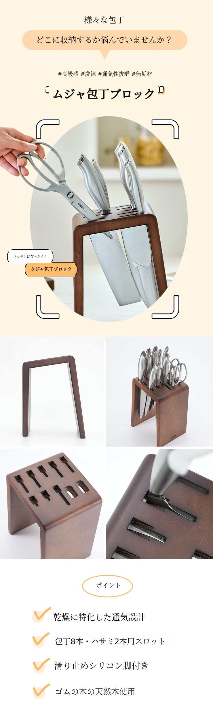 クジャの木製ナイフブロックには、クドP-01(サントク)からP-08(ミニシェフナイフ)まで合計8種類のナイフと一緒にクジャハサミも収納可能です。お持ちのナイフやハサミを保管しても良いですよ!