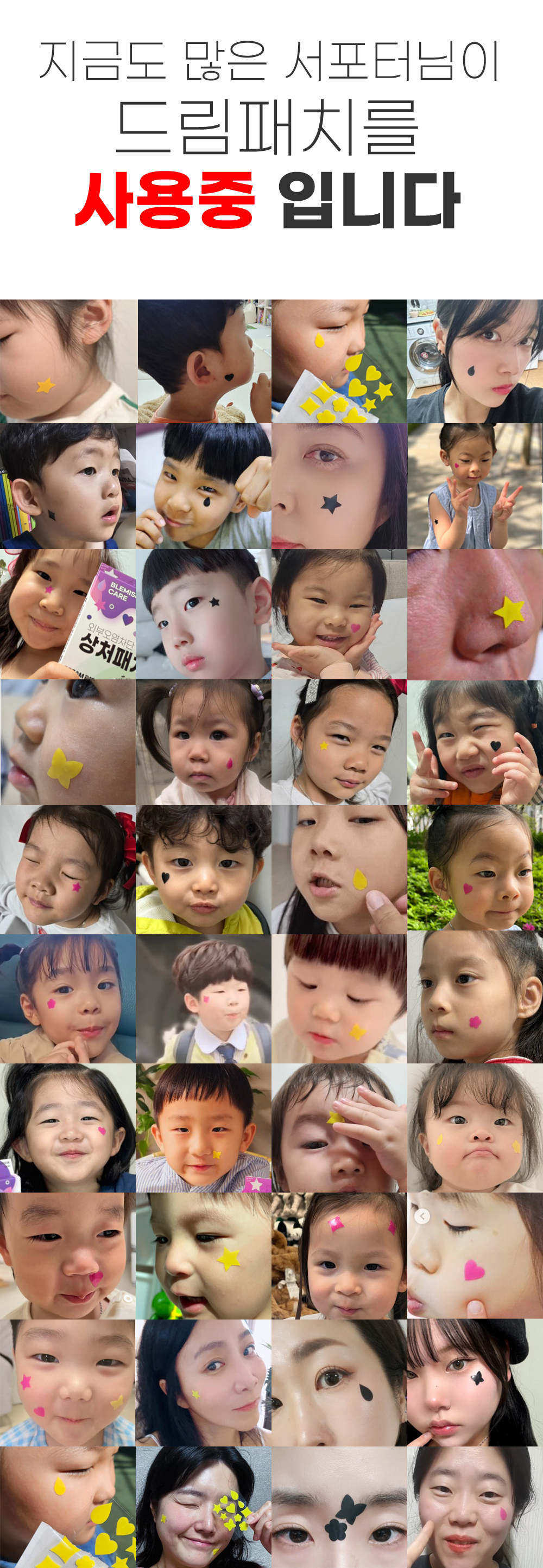 드림패치는 일반 상처보호패치와 동일한 하이드로콜로이드 100% 성분으로 제작된 상처패치 입니다. 식약처에 정식 허가 된 제품으로 기능과 성능은 일반 습윤밴드와 같으나 모양과 색깔이 있어 다채로운 스타일 연출에 용이합니다. 다친 부위가 거슬리는 분들에게 드림패치를 붙이며 기분 전환에도 큰 도움을 받을 수 있습니다. 얼굴과 몸에 난 상처에 모두 사용가능하며 낱개 이중포장으로 사용도 용이합니다. 사용이 편리한 드림패치, 이제 우리집 필수템으로 제격입니다. 항상 응원해주시는 서포터님께 감사드립니다.
