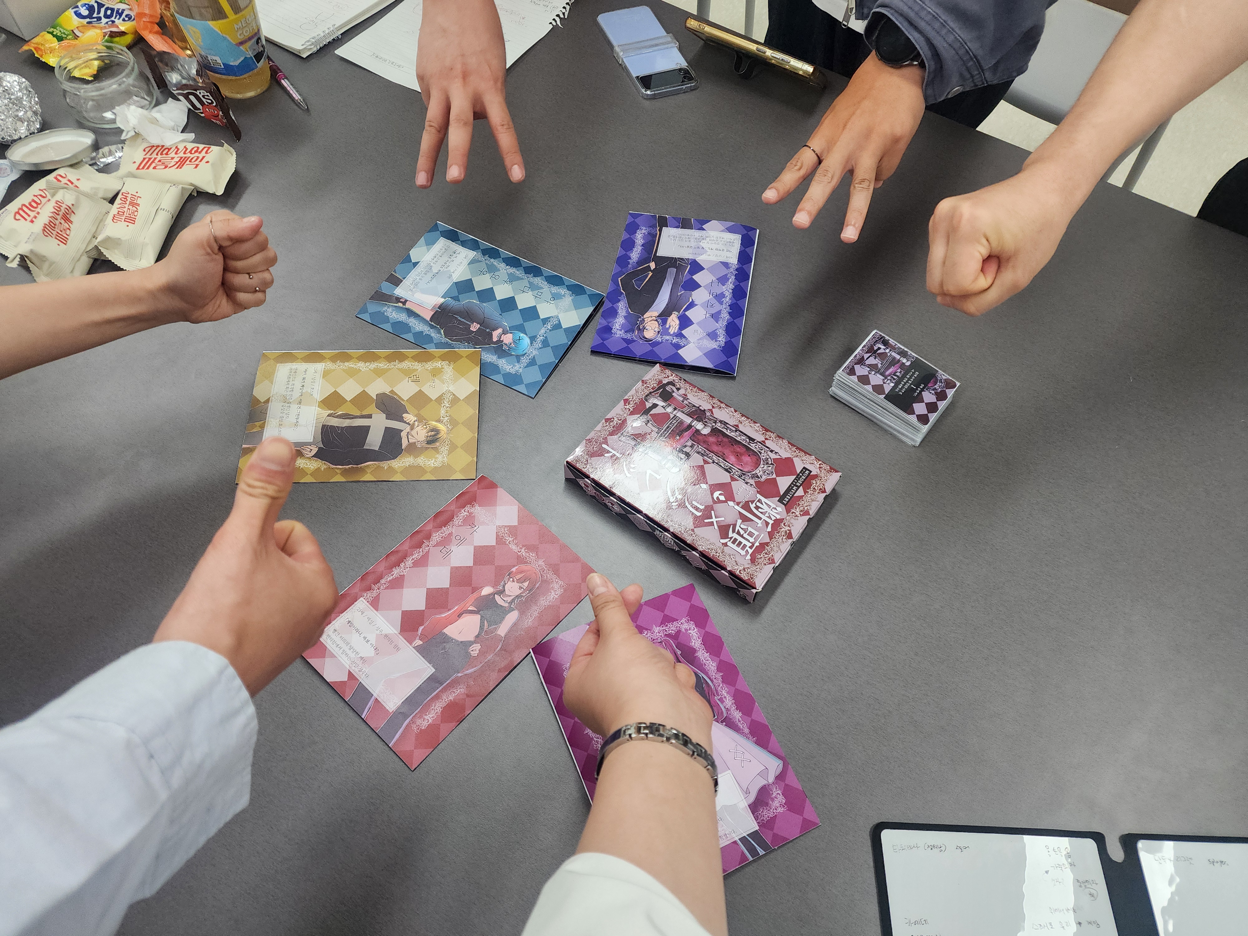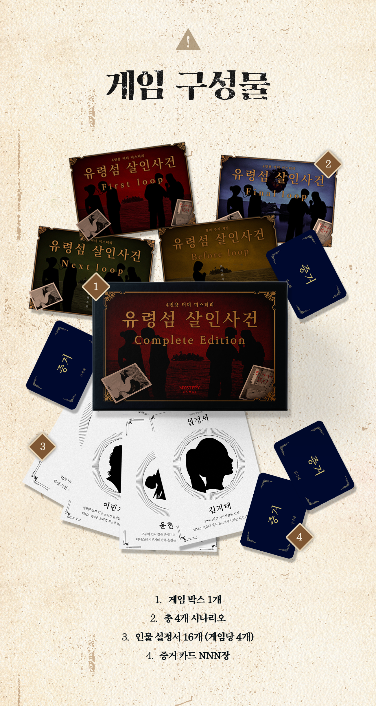 2. 스쿨드 카드 50(스포 방지 카드 포함) / 게임설명서 / 엔딩 북 / 지도 / 각 인물 설정서 4장