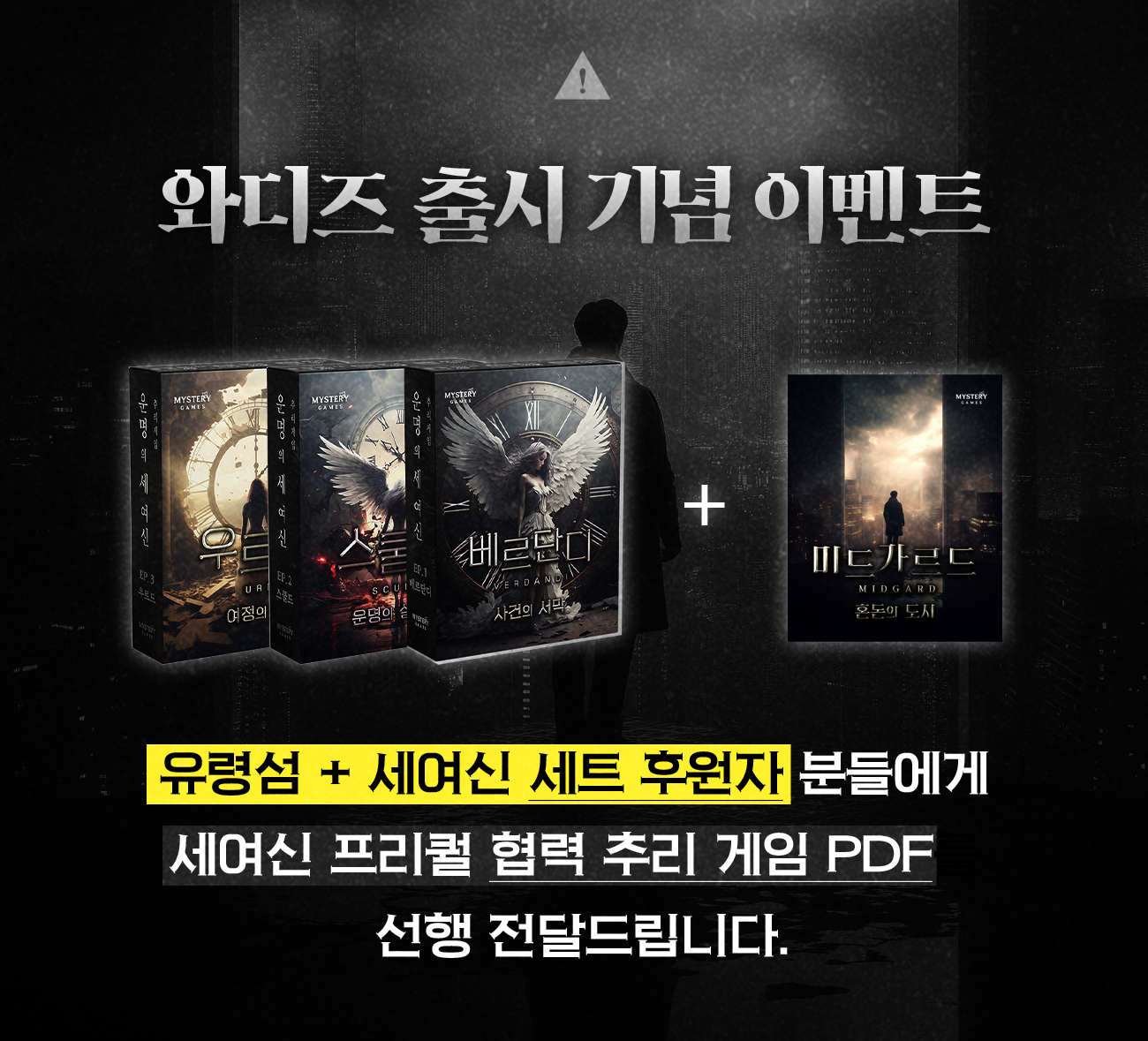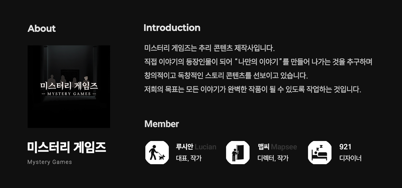 미스터리 게임즈는 2024년 자체 제작 추리 보드게임 <운명의 세 여신>을 시작으로 다양한 추리, 머더 미스터리 보드게임을 제작, 출판하고 있습니다. 일본의 머더 미스터리 보드게임 유통 뿐 아니라 국내 다양한 분야의 추리게임을 자체 제작 중이며, 추리 게임이 대중적으로 알려질 수 있도록 다양한 행사를 펼치고 있습니다. 이번에는 와디즈를 통해 새로운 후원자분들에게 좋은 프로젝트를 선보일 수 있도록 최선을 다하겠습니다.