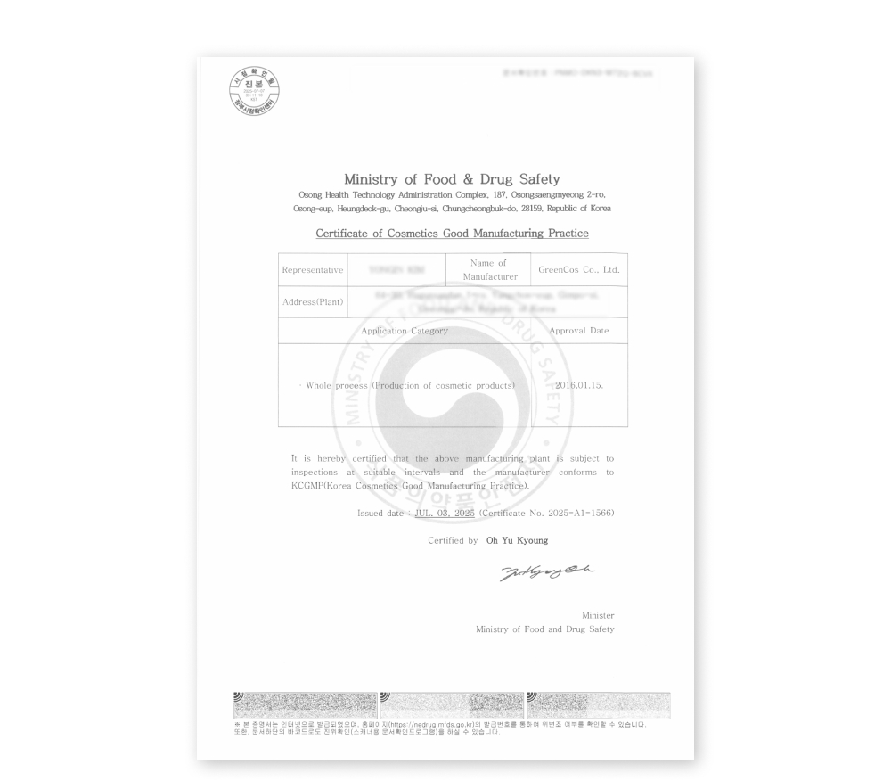 CGMP는 대한민국 식약처가 관리하는 화장품 우수 제조업체 인증 제도로, 철저한 생산과 품질 관리 기준을 통과한 소수의 업체에게만 부여됩니다.