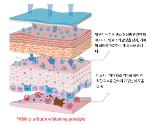저희는 이 알부틴을 칙칙하고 어두운 피부를 화사하게 표현하는 핵심 원료로 보고 주원료로 사용했습니다.