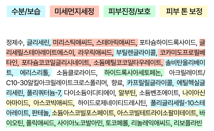 나에게 맞는 제품을 찾기 위해선 성분 이해가 가장 중요합니다. 그래서 전성분을 기능별로 나누어 쉽게 확인할 수 있도록 정리했습니다.