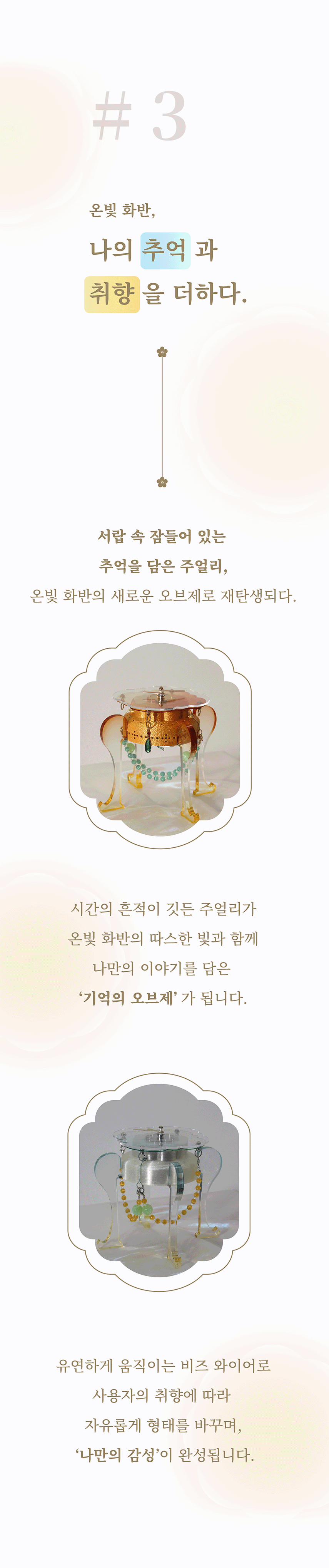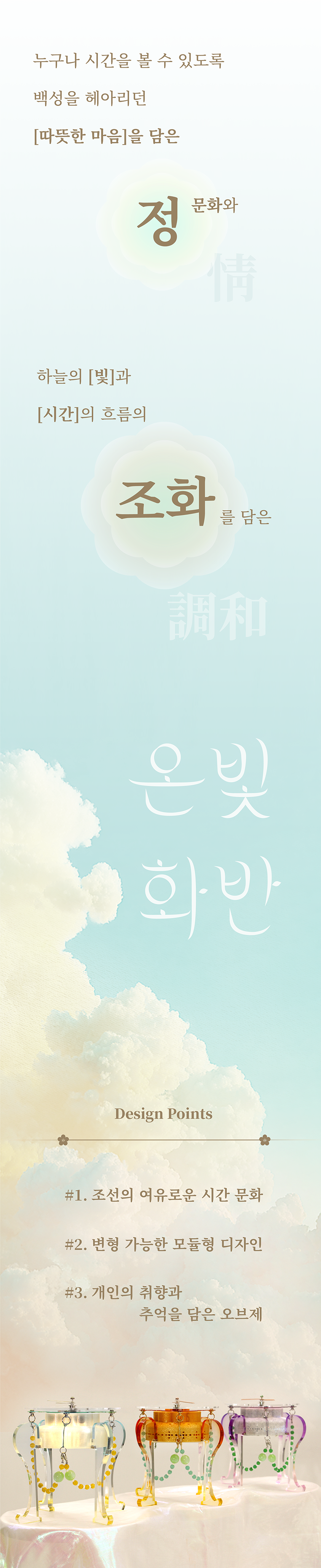 1. 🕰️ 朝鮮の日時計オブジェ - 朝鮮のアンブイルグから着想を得た感性オブジェです 2. 💡 光と時間のモジュール照明 - 光と時間を表現する変形可能なモジュール照明です 3. 🎁 限定感性デザイン - 伝統と現代が調和した特別な初コレクションです