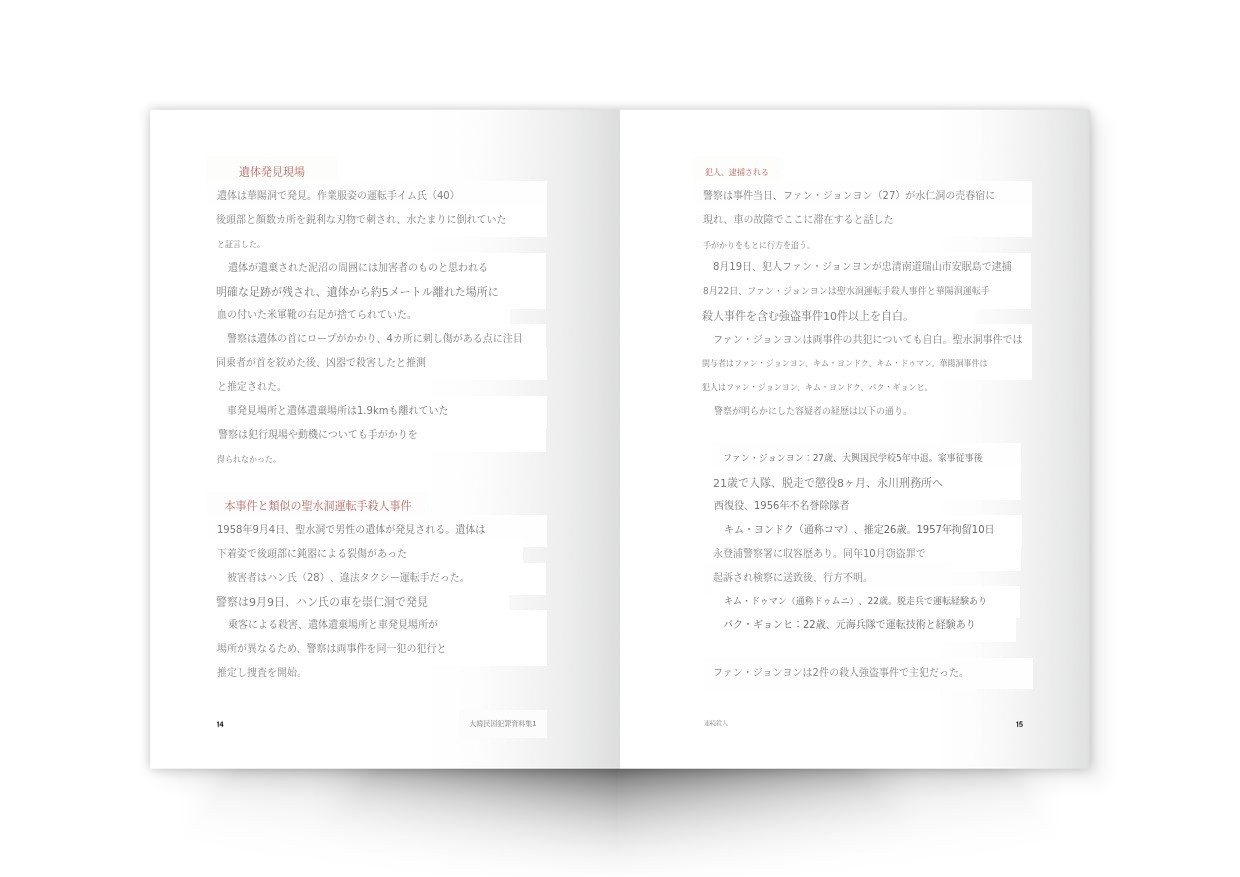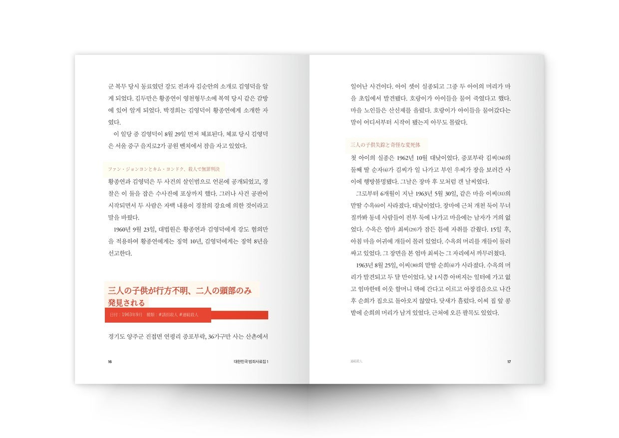 既存シリーズではこのような部分がそのまま露出していた場合もありましたが、リブートされた<大韓民国犯罪史料集>(全3巻)は違います。すべての記事を現代の読者が読めるように再整理しました。