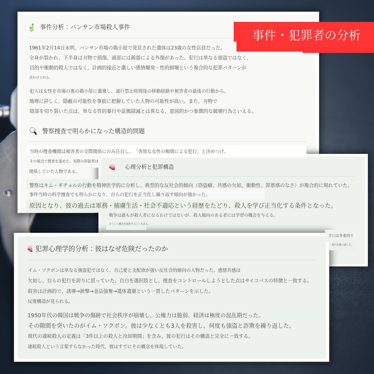 単なる事実の集まりではなく、プロファイリングや社会的背景の分析まで一緒に提示します。