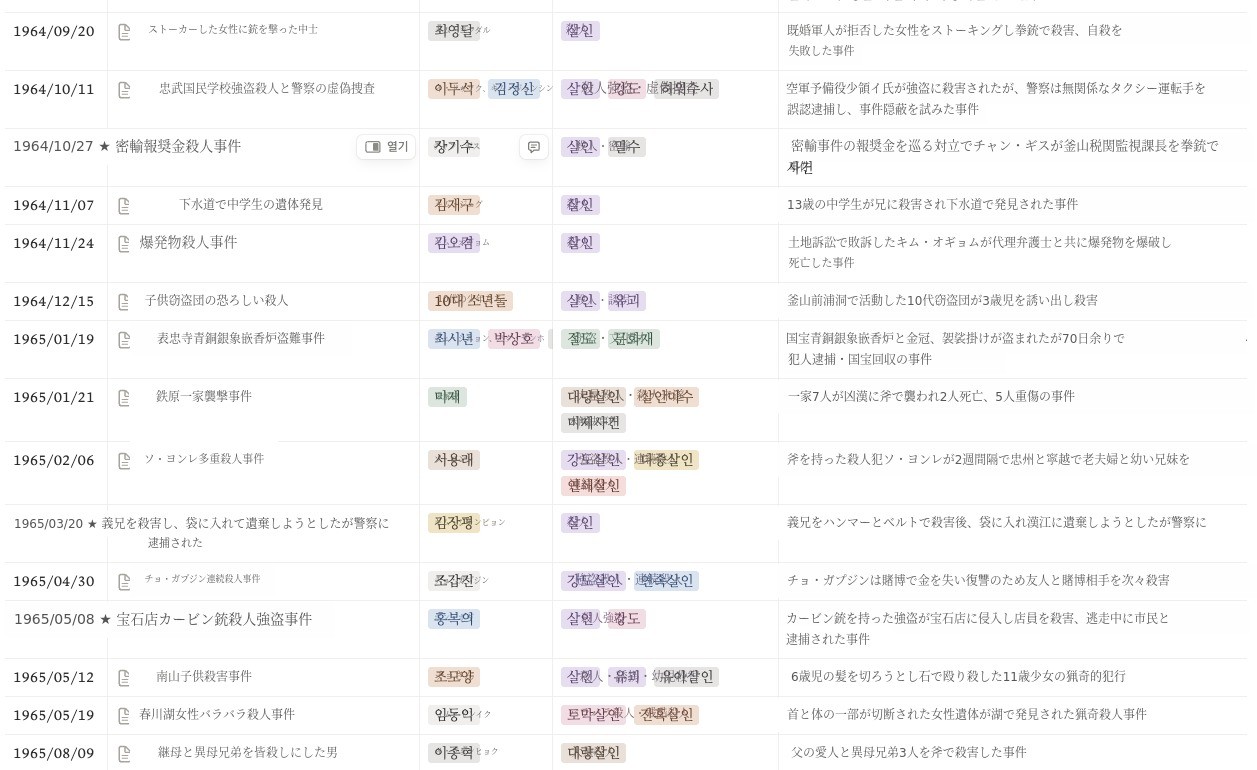 2000年までの大韓民国犯罪史料集には700件を超える事件が収録されていますが、事件の形態や内容が似ている事件を除外し、Notion資料集に収録する予定です。