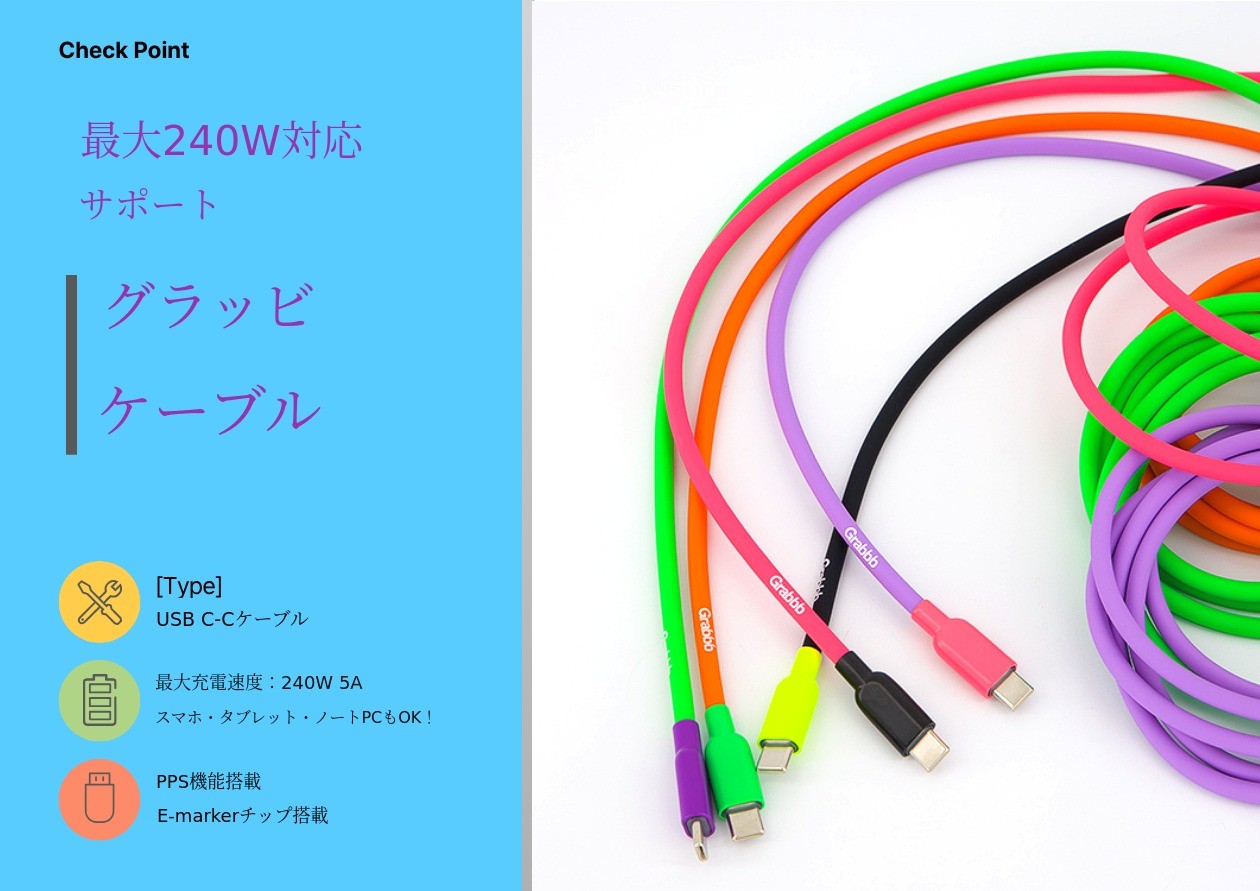 - 最大240W対応ケーブルでモバイルからノートパソコンまで余裕の電力!