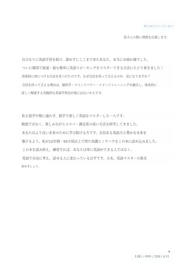 過去13年間、50カ国の人々と交流しながら積んだ経験、OPIcなどの英語試験の成績達成、外資系企業の英語面接や就職成功を通じて検証したノウハウを今回の電子書籍にすべて詰め込みました。皆さんが英語をもっと簡単に、自信を持って話せるようお手伝いしたいです。」