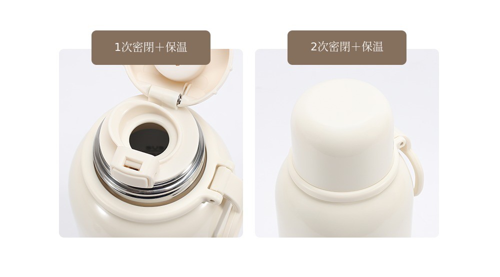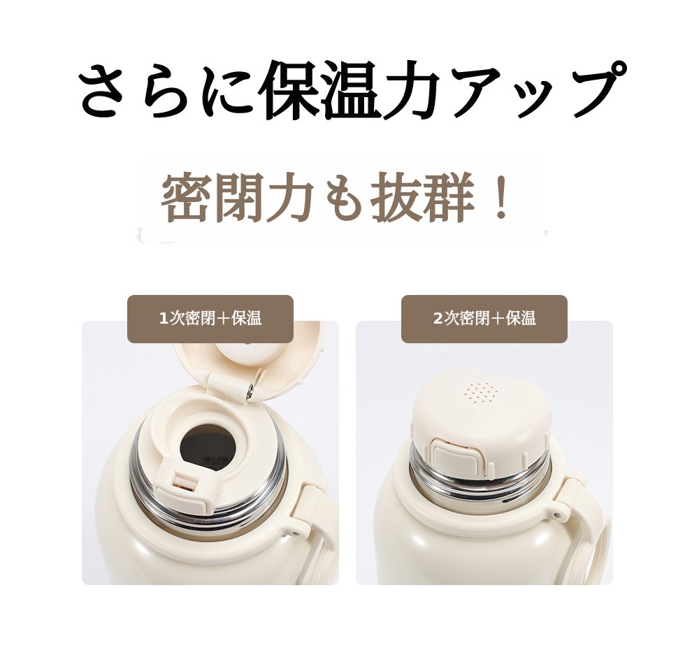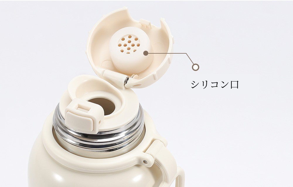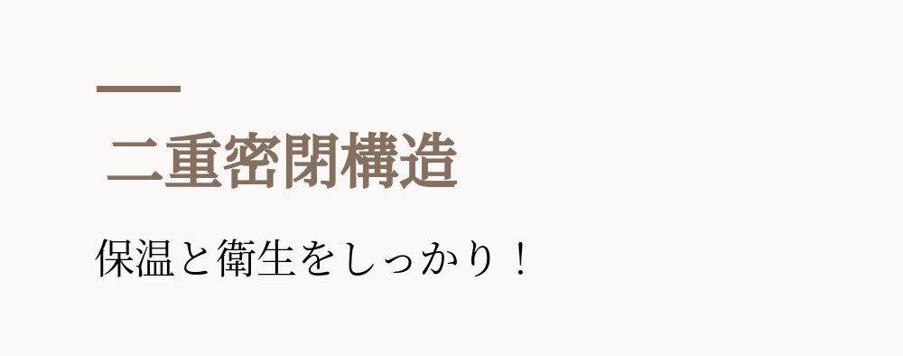 1段シリコン栓で一度密閉し、2段で二重キャップによる保温 密閉して温度保持を高めつつ、外部のほこりや異物から安全に保護します。