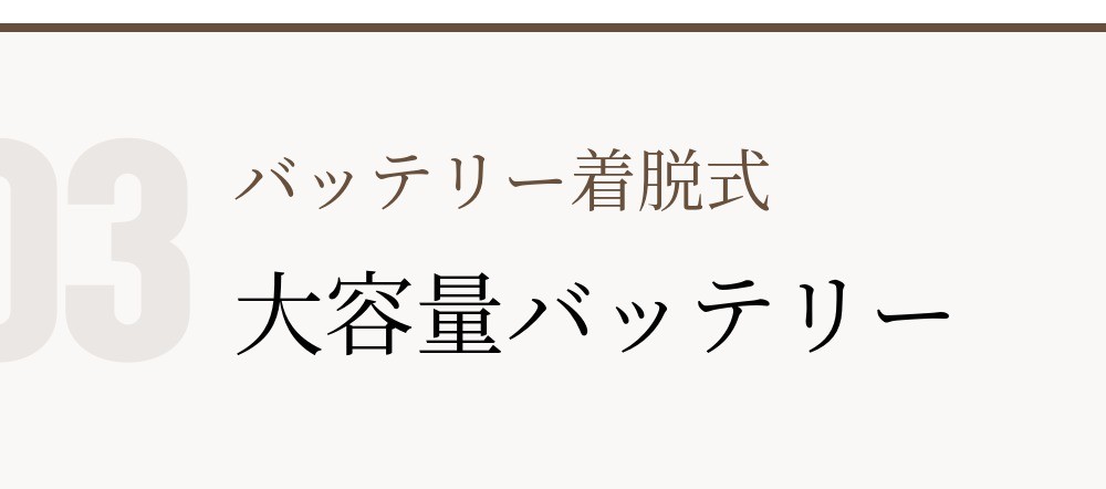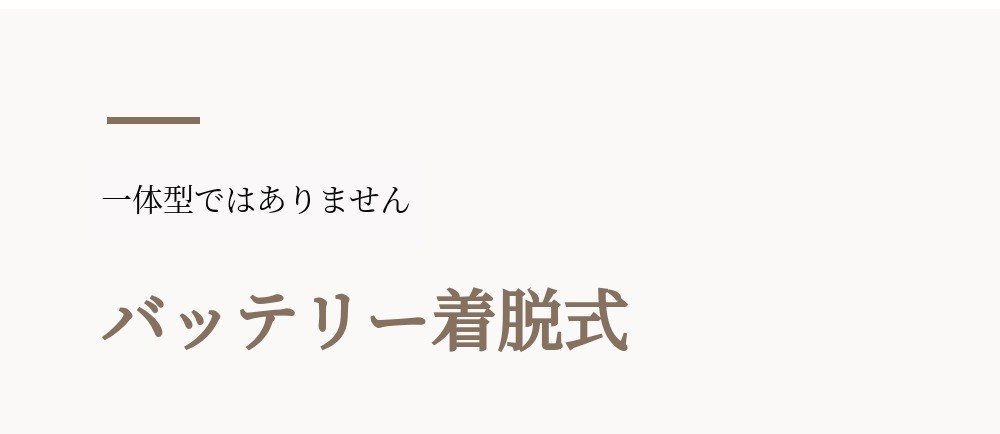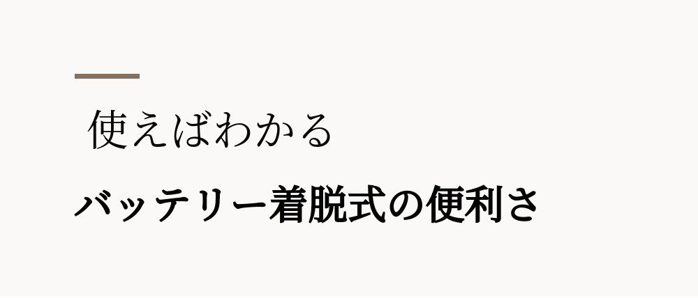 本体と一体型ではなく、バッテリーを分離して充電し、着脱する方式で充電不良を最小限に抑え、予備バッテリーがあれば交換しながら使用できます。