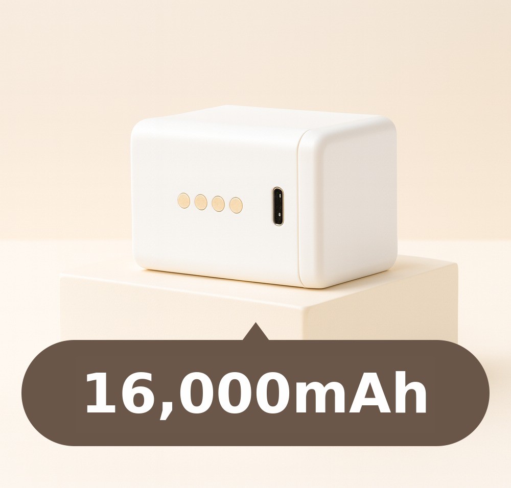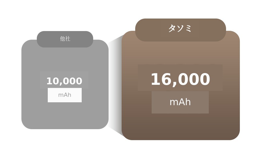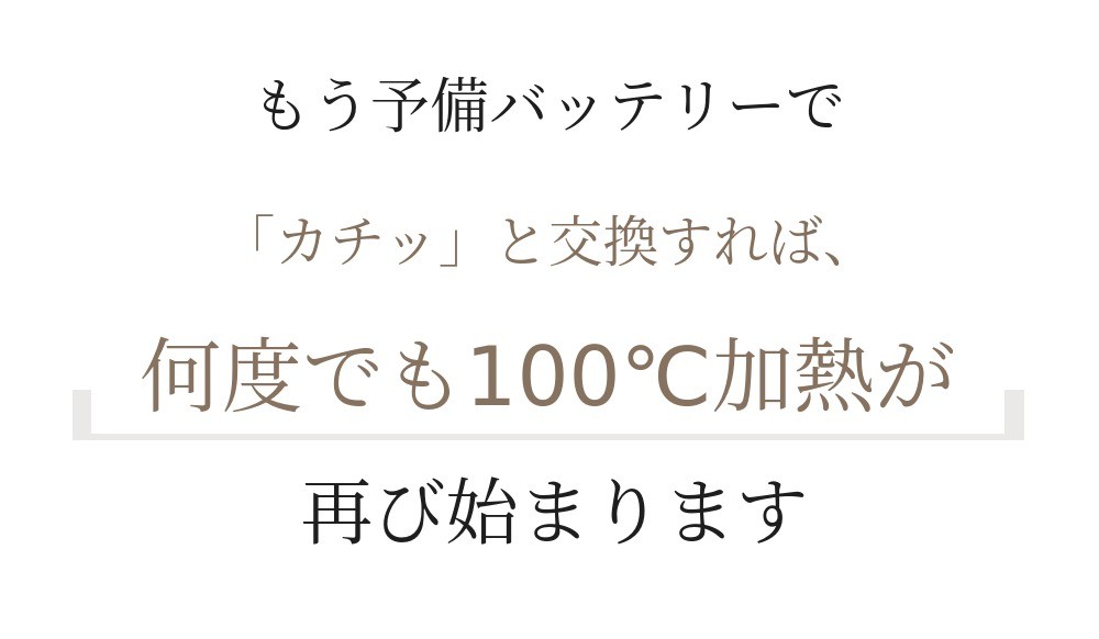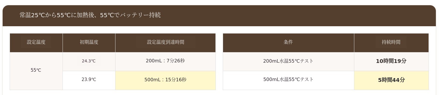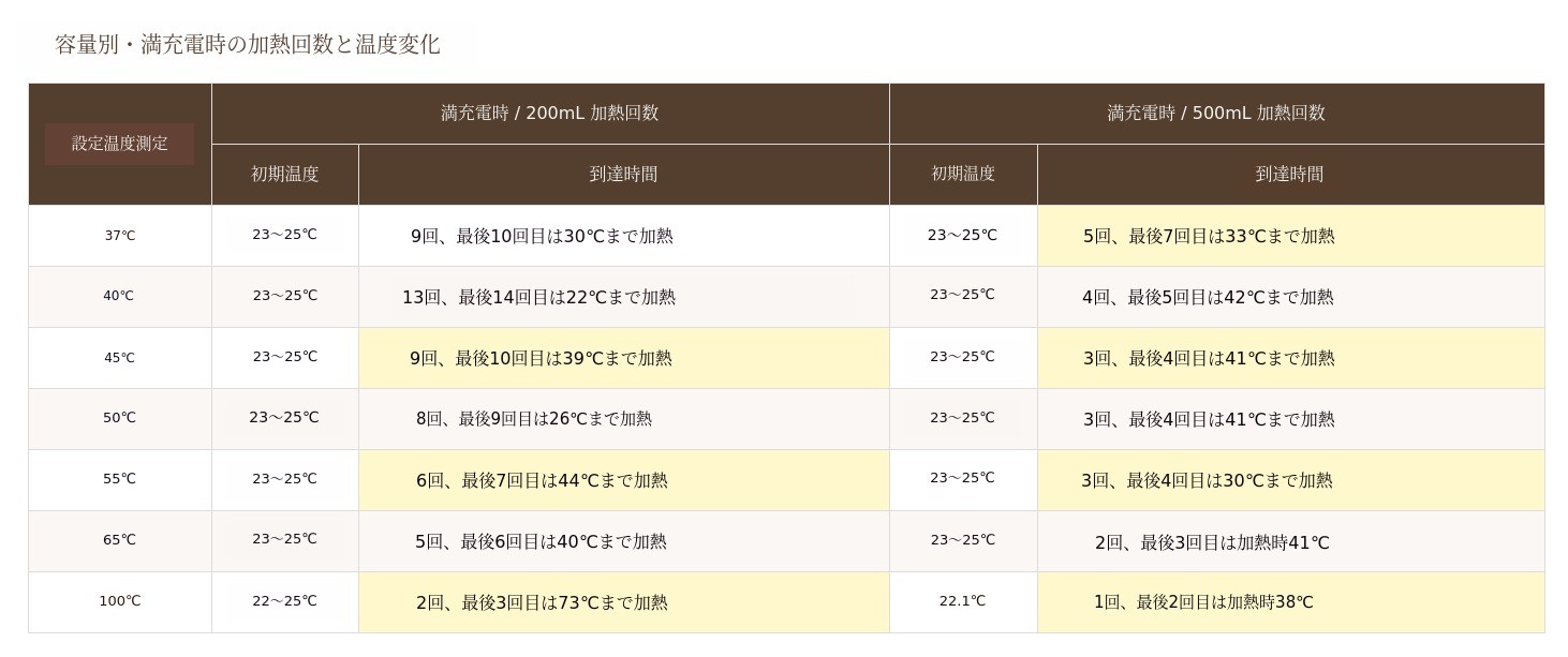他社10,000mAh容量のバッテリーと比べると、圧倒的に高いバッテリー容量を持っています。だから一度充電すれば、100度まで1回完全加熱後、65度で1回沸かすことが可能です。