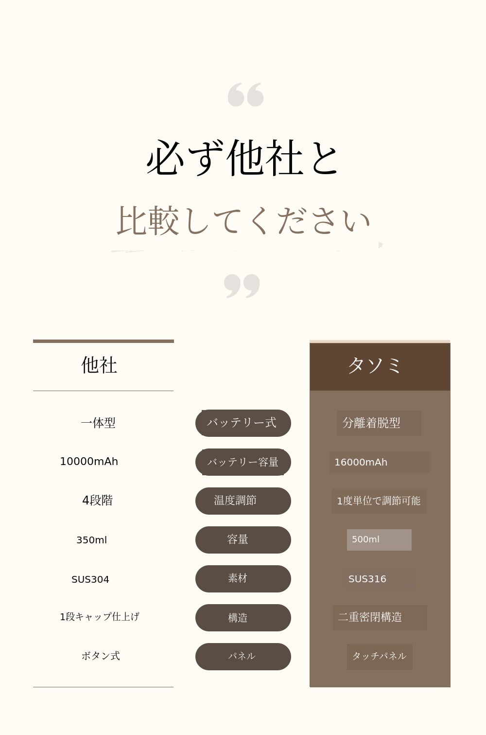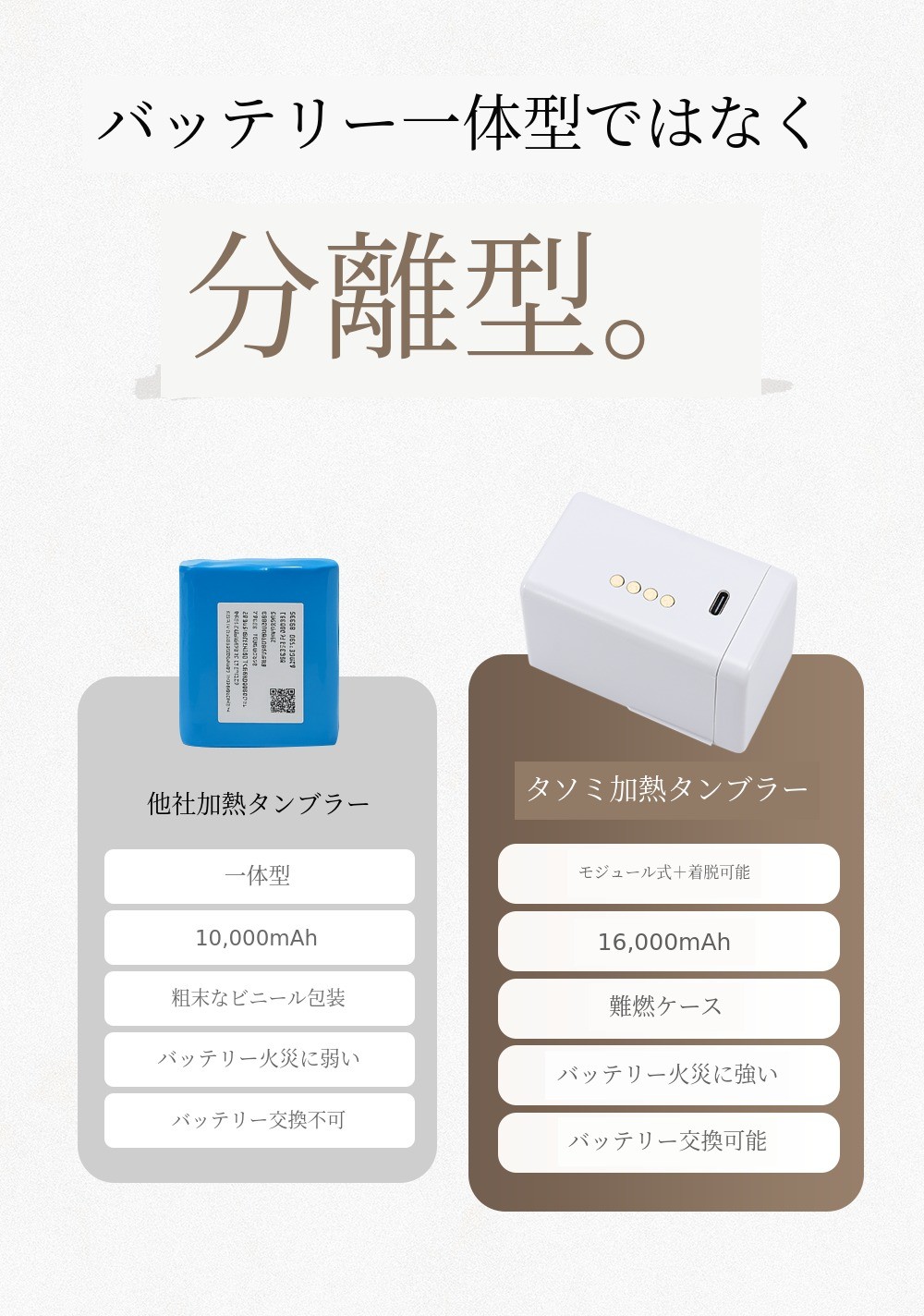 一般的に他社製品はバッテリーとタンブラーが一体型の場合が多く、製品自体に充電ケーブルを差し込んで充電する方式です。しかしタソミは製品自体で充電する形ではなく、バッテリーを分離して充電する方式です。