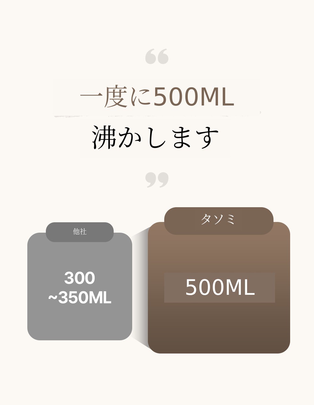 一般的に300~350MLは沸かして使うと量が足りない場合が多いです。たっぷり500MLで不足なく一度に沸かしてご使用ください。