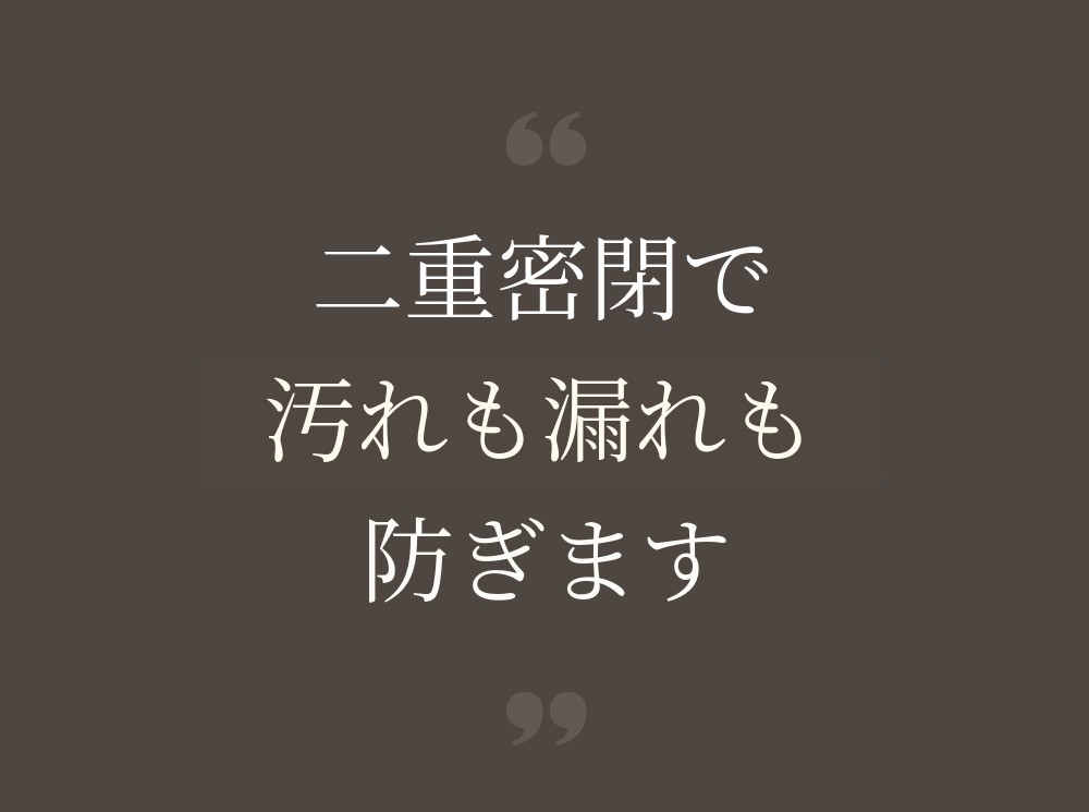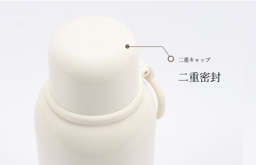 二重構造で密閉するため、製品を逆さにしても水が漏れず、さらに外側の二重キャップが内部に入るほこりや汚れを防ぐ効果もあります。